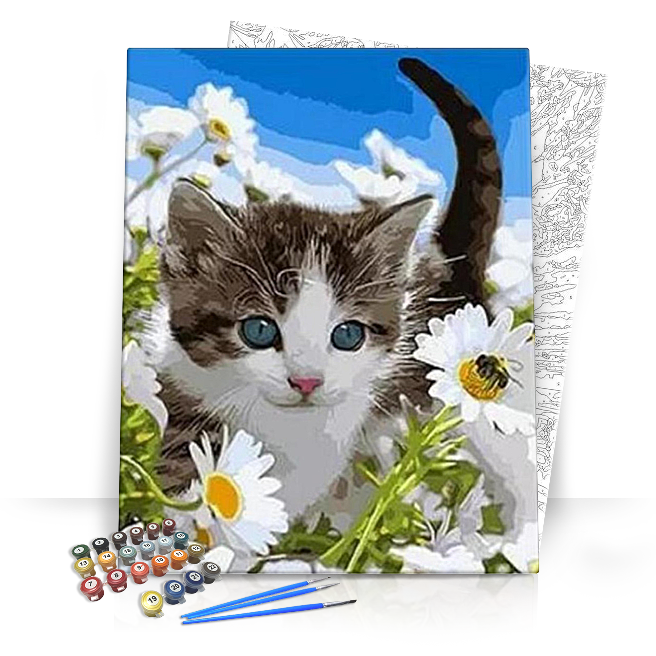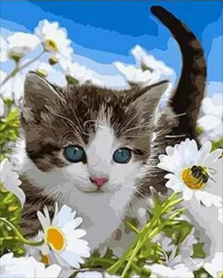 Merülj el a festészet kellemességében a A Legaranyosabb Macska számfestő készlet révén! Ez a csodálatos kép egy kis cica mézes csokros virágok között fekszik, élénk kék háttérrel, mely frissességet és boldogságot sugall. Az aranyos kis macska nagy, kék szemekkel és fehér-fekete színkombinációval varázsolja el a tekinteteinket. A háttérben elhelyezkedő virágok - a fehér margaréták és a zöld fű - egy igazán vidám hangulatot teremtenek.