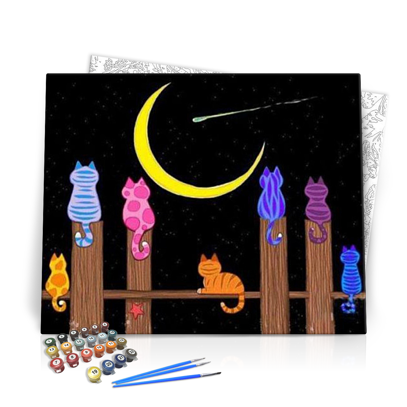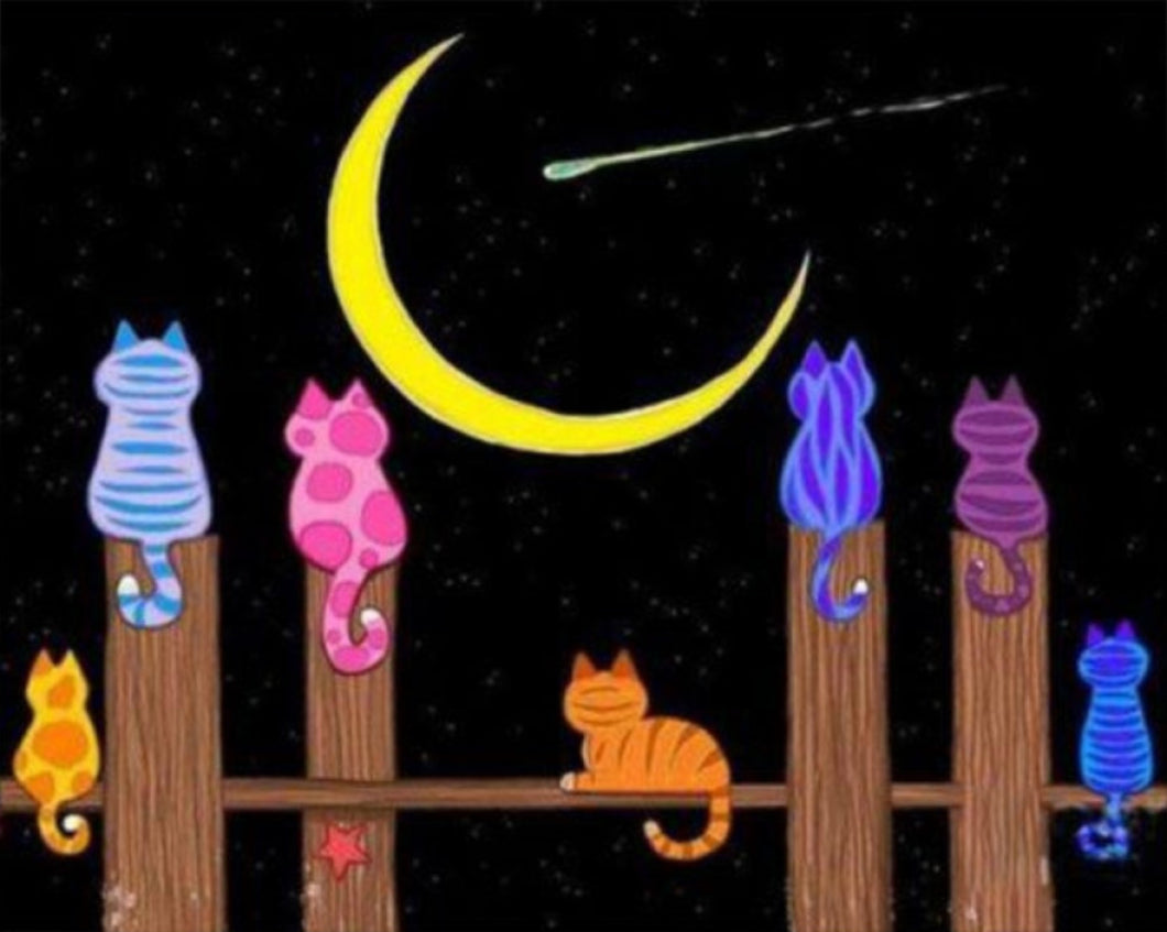 Képzeld el, ahogy az éjszakai égbolt alatt, a csillagok fénye és a kerek hónap mellett a legkedvesebb négylábú barátaid pihennek. Ez a mesés festmény egy varázslatos pillanatot ragad meg, ahol aranyos macskák ülnek egy fából készült kerítésen, miközben egy hullócsillag suhan el felettük. A színek élénkek és vidámak, minden macska különböző, színes csíkokkal és mintákkal díszítve, a háttér pedig gazdag feketéjével a mély éjszakát idézi meg.