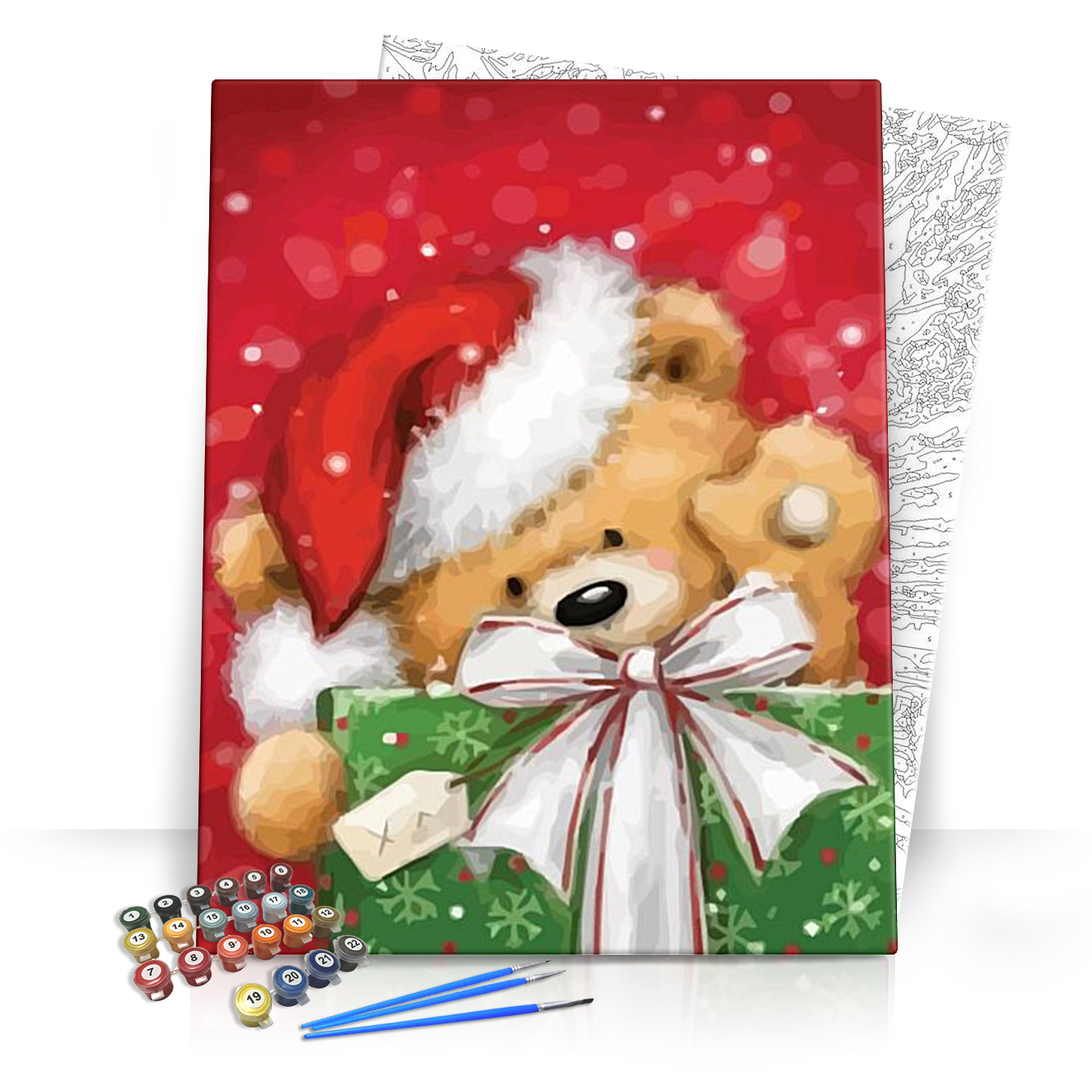 Engedd szabadjára a kreativitásodat ezzel a mesés számfestő készlettel, amely nemcsak szórakoztató, de tökéletes ajándék is a karácsonyi időszakban! A készlet segítségével egy aranyos mackó képe elevenedik meg, amely vidáman integet egy csodás zöld ajándékdobozt ölelve. A cuki mackó adventi sapkája felidézi a karácsony hangulatát, a hátteret pedig a bíborvörös szín és a finom hópelyhek teszik igazán varázslatossá.
