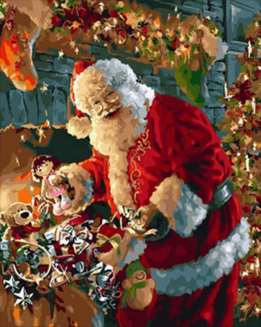 A kép színes és gazdag részletekkel bír: a Mikulás élénk vörös ruhájában, a diszkrét fenyőágakkal, a színes ajándékokkal és a szeretett butikfigurákkal, mint például a plüssmacik, olyan érzést kelt, mintha a karácsonyi csoda közepén lennél. A festmény különleges stílusa és elsöprő színei mindenkit magukkal ragadnak!