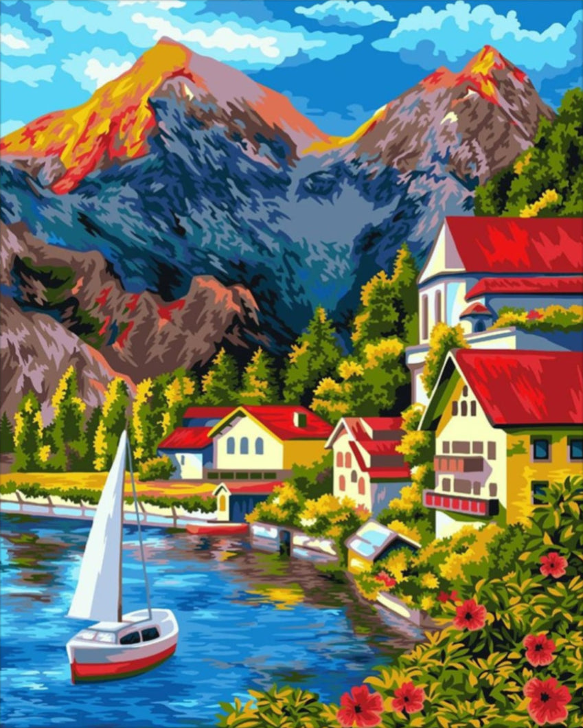 Az Alpesi táj festmény egy idilli kép a hegyek, tavak és festői falvak varázsát mutatja be, ahol a ragyogó kék vízben vitorlás hajó ringatózik és a környező hegyek őszi színekben pompáznak. A festmény különlegességét nemcsak a színekkel való játék, hanem a viharos felhők és a napfényes hegycsúcsok kontrasztja adja. Az élénk vörös, sárga és zöld árnyalatok mindenki szívét megnyerik.