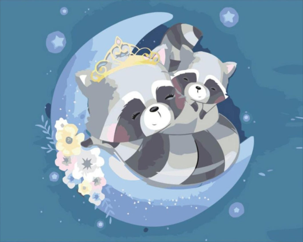 A kép főbb elemei között találhatók a boldog mosómedvék, akik egy nagy holdszerű háttér előtt ölelkeznek, körülöttük csillagok és virágok tündökölnek. Az árnyalatok lágy kék és szürke tónusai tökéletes összhangban állnak a fehér és színes virágokkal, így minden egyes ecsetvonás egy új élményt jelent.