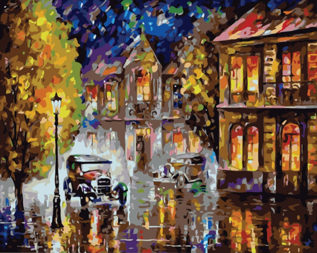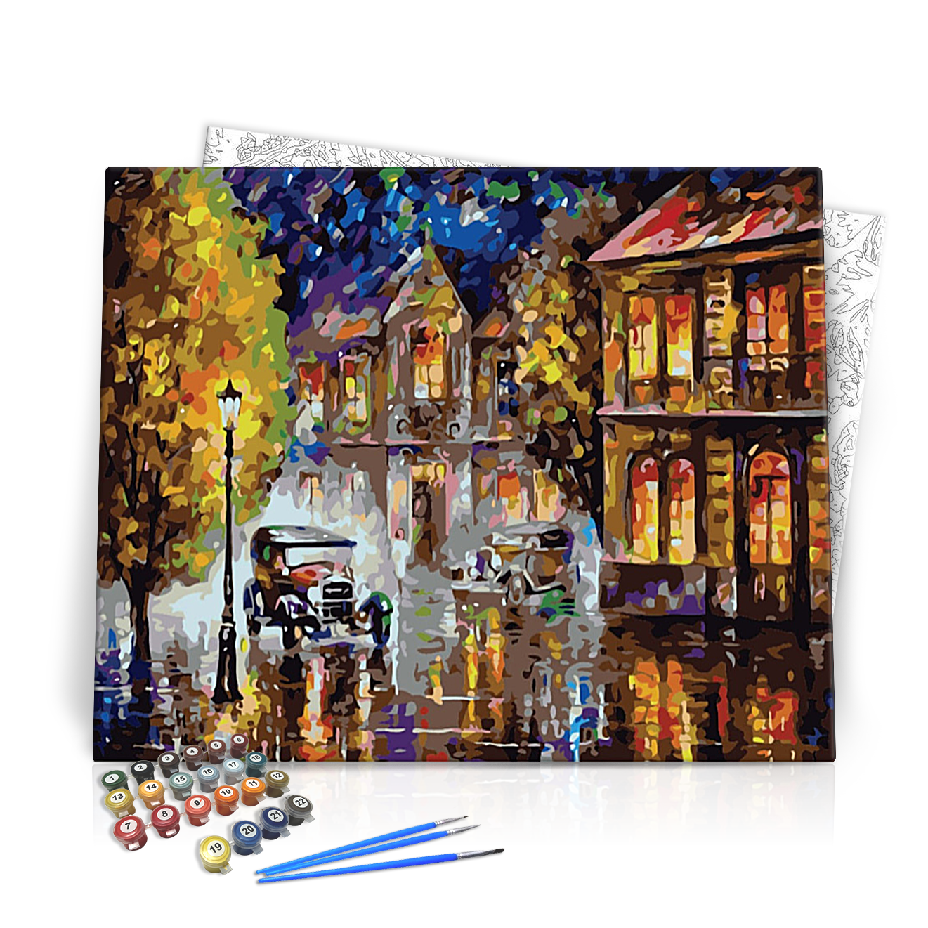 Fedezze fel a festészet varázsát otthona kényelméből! Az Angol Esti Utcakép számfestő készlet segítségével egy lenyűgöző, színes városi jelenetet hozhat létre, amely az esőcseppek által csillogó utcákat és a gyönyörű, világító ablakokat ábrázolja. A festmény hangulata nosztalgikus és romantikus, a richárd, fenyő és mustársárga színek keveredésével tölti meg a teret, mintha egy varázslatos estét örökítene meg, amelyben a régi autók és a világító lámpák valósággal életre kelnek.