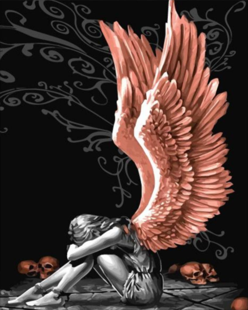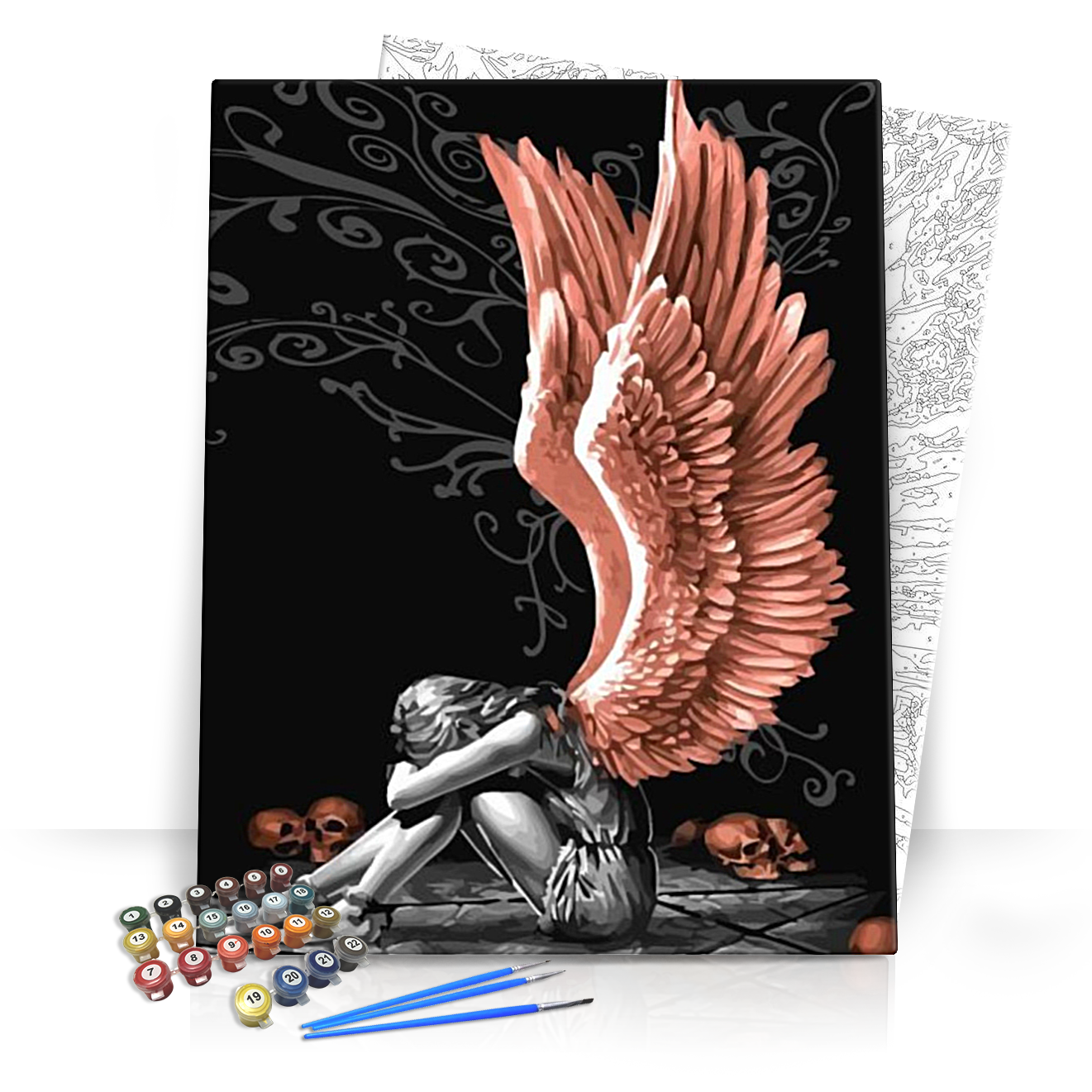 Fedezd fel a kreativitás határait az Angyali pihenés - számfestő készlet segítségével! Ez a lenyűgöző készlet egy lenyűgöző angyalt ábrázol, aki mélázva ül, nagy, gyönyörű szárnyai a háttérben tündökölnek. A kép háttere fekete, amely kiemeli a gyönyörű rózsaszín szárnyakat és a finom vonalakkal díszített részleteket, a koponya szimbólumok pedig titokzatos hangulatot adnak a kompozícióhoz. A mélyebb színek és a szimbolikus elemek izgalmas festési élményt nyújtanak!