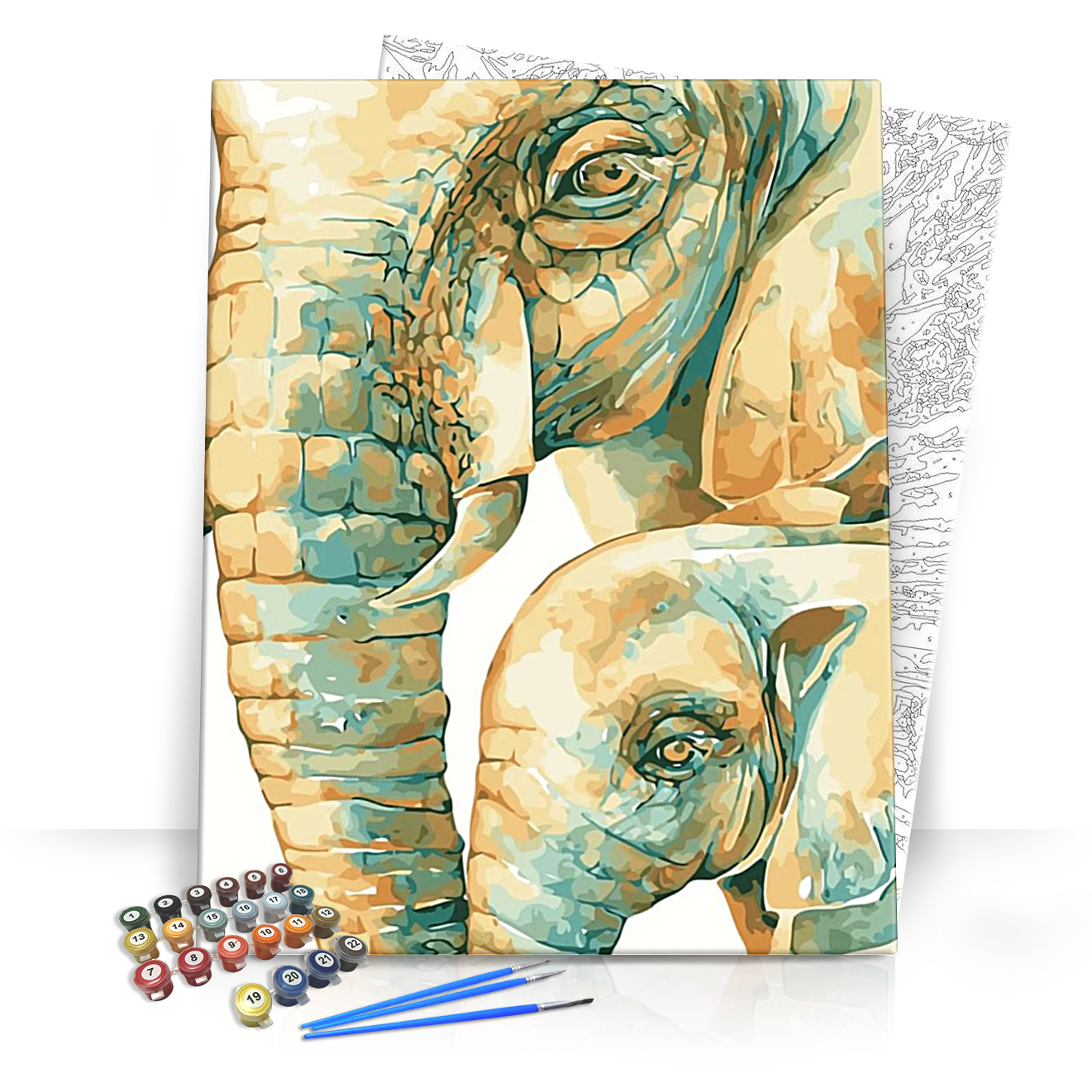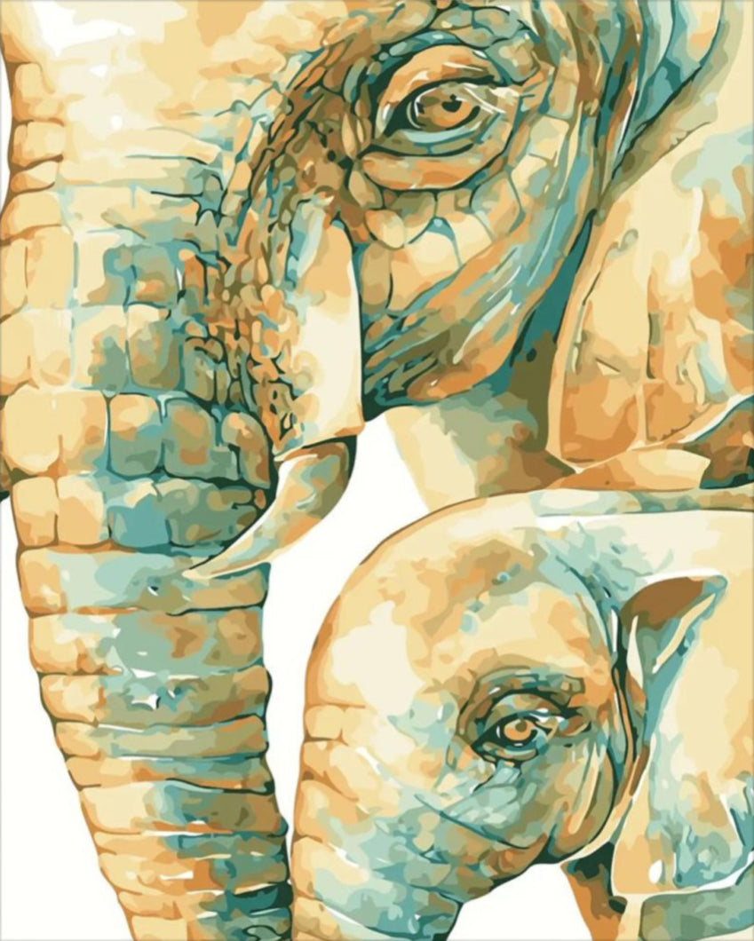 Ez a festmény két elefánt, egy anya és egy kicsi, szoros kapcsolatának intim pillanatát örökíti meg. A számfestő készlet megjeleníti a tapintatos, meleg árnyalatokat, mint a narancs, zöld és bézs, amelyek harmonikusan keverednek, és életre keltik a nagyméretű állatok szépségét és erejét. Az elefántok részletei, mint a tekintetek és a textúrák, a természet csodáit tükrözik, így mindenki szívesen elmélyedhet a festés élményében.