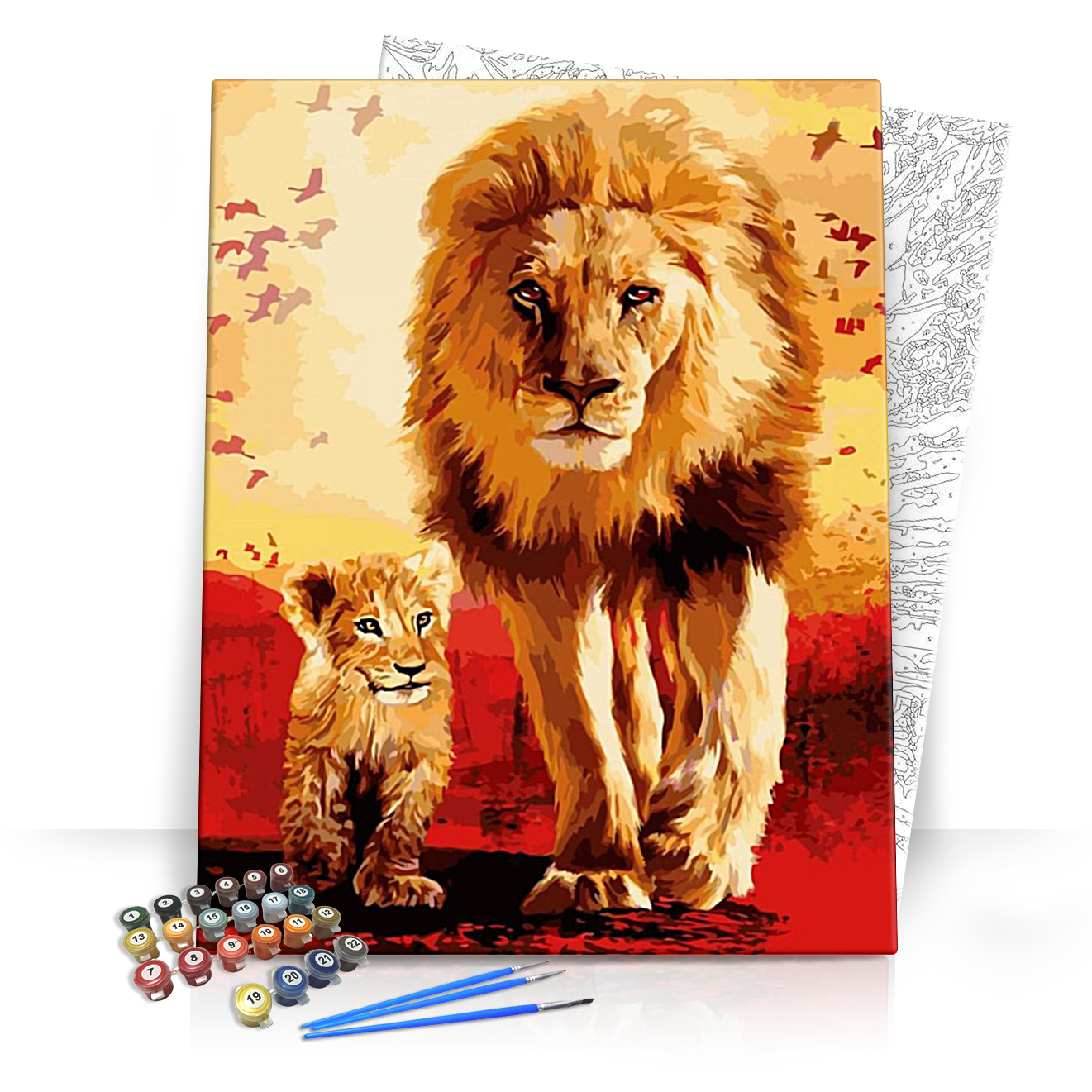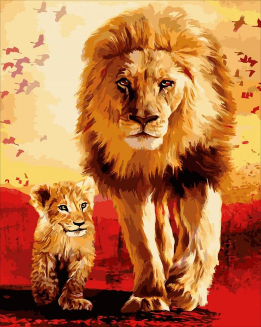 Merülj el a festészet varázslatos világában a Apa és fia számfestő készlettel, amely a vadon szívverését hozza el otthonodba! Ez a lenyűgöző kép egy impozáns oroszlánt és kölyökét ábrázolja, akik bátorsággal és szeretetteljes kötelékkel lépnek a festővászonra. Az aranybarna és vörös árnyalatok melegséget sugallnak, és a háttérben repkedő madarak színes mozgása teszi még élénkebbé a jelenetet.