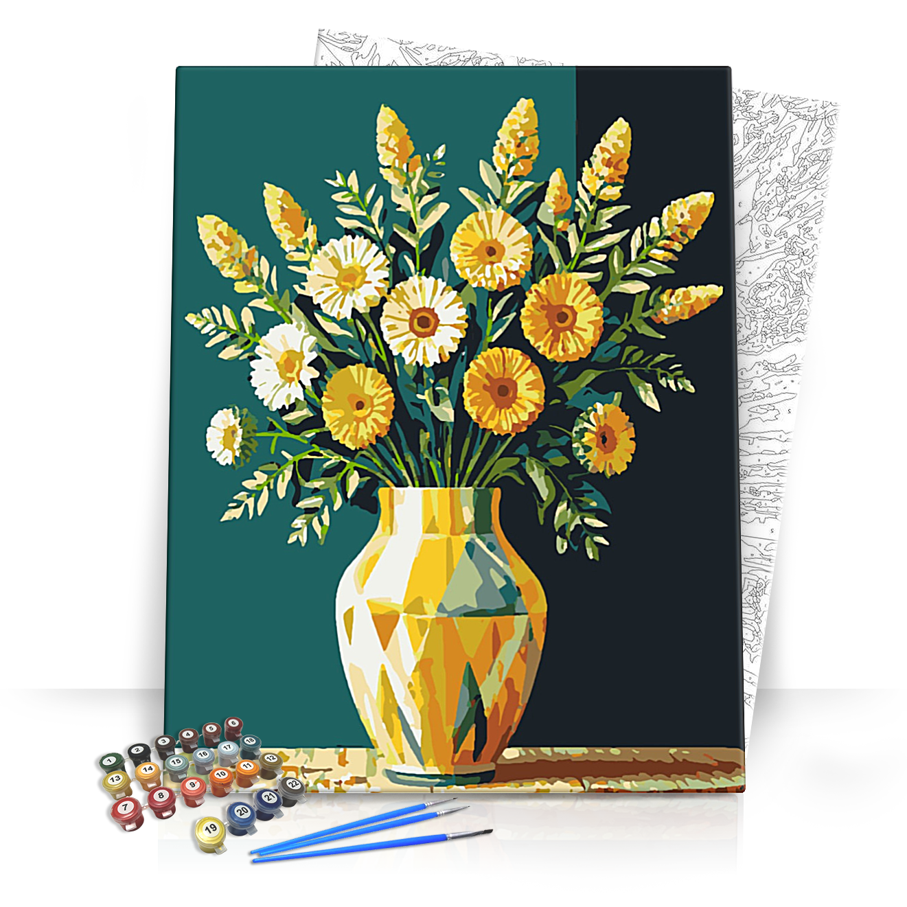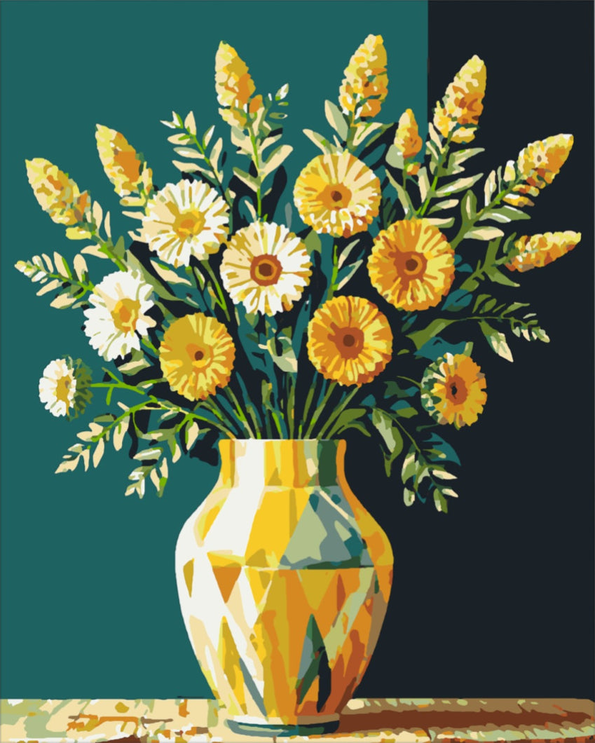 Fedezd fel a művészet varázslatos világát az "Aranyló margaréta - számfestő készlet" segítségével! Ez a gyönyörű festmény egy teli virágcsokrot ábrázol, ahol a napfény sárga árnyalatai méltóságteljes margarétákkal keverednek. A vázában elhelyezett színes virágok mellett a színpompás zöld levelek adnak egy frissítő kontrasztot a lágy háttérrel. Az olajzöld és sötétkék árnyalatok együttese kiemeli a virágok ragyogását, és meleg, otthonos hangulatot áraszt, amely felfrissíti bármelyik helyiség légkörét.
