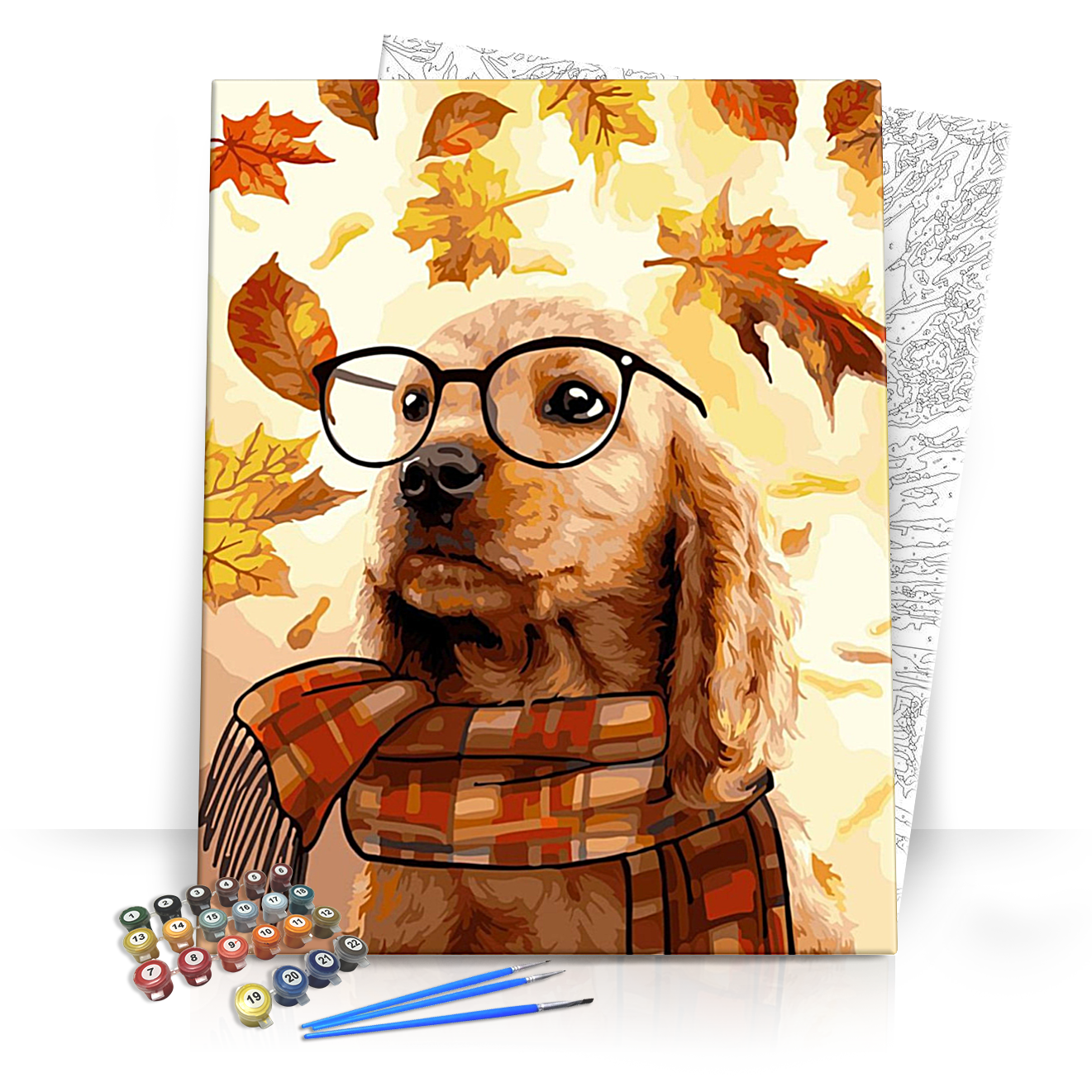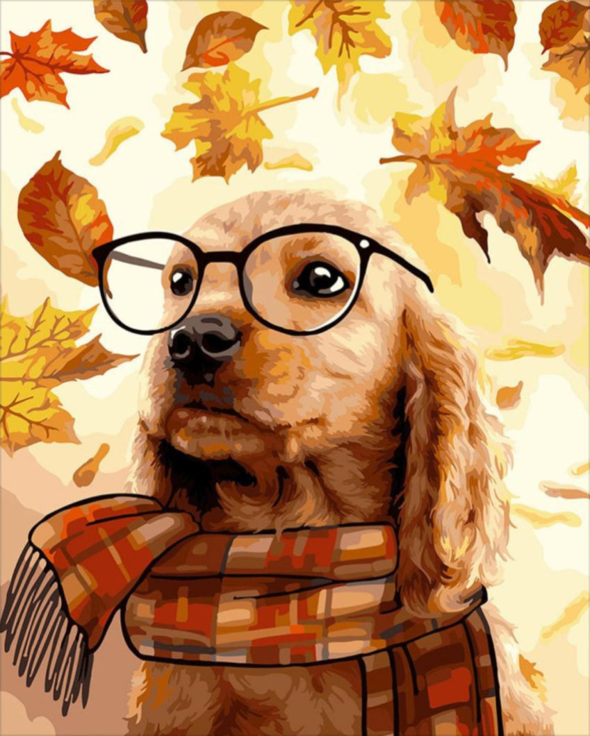 Merülj el a festészet varázslatos világában az "Okos kutya" számfestő készlettel! Ez a különleges készlet egy aranyos, szemüveges kutyust ábrázol, aki egy meleg, kockás sálat visel, míg a háttérben őszi falevelek táncolnak a levegőben. Az élénk színek és a játékos stílus mindenki számára boldogságot hoz, és inspirálja a kreativitást, függetlenül a festői tudás szintjétől.