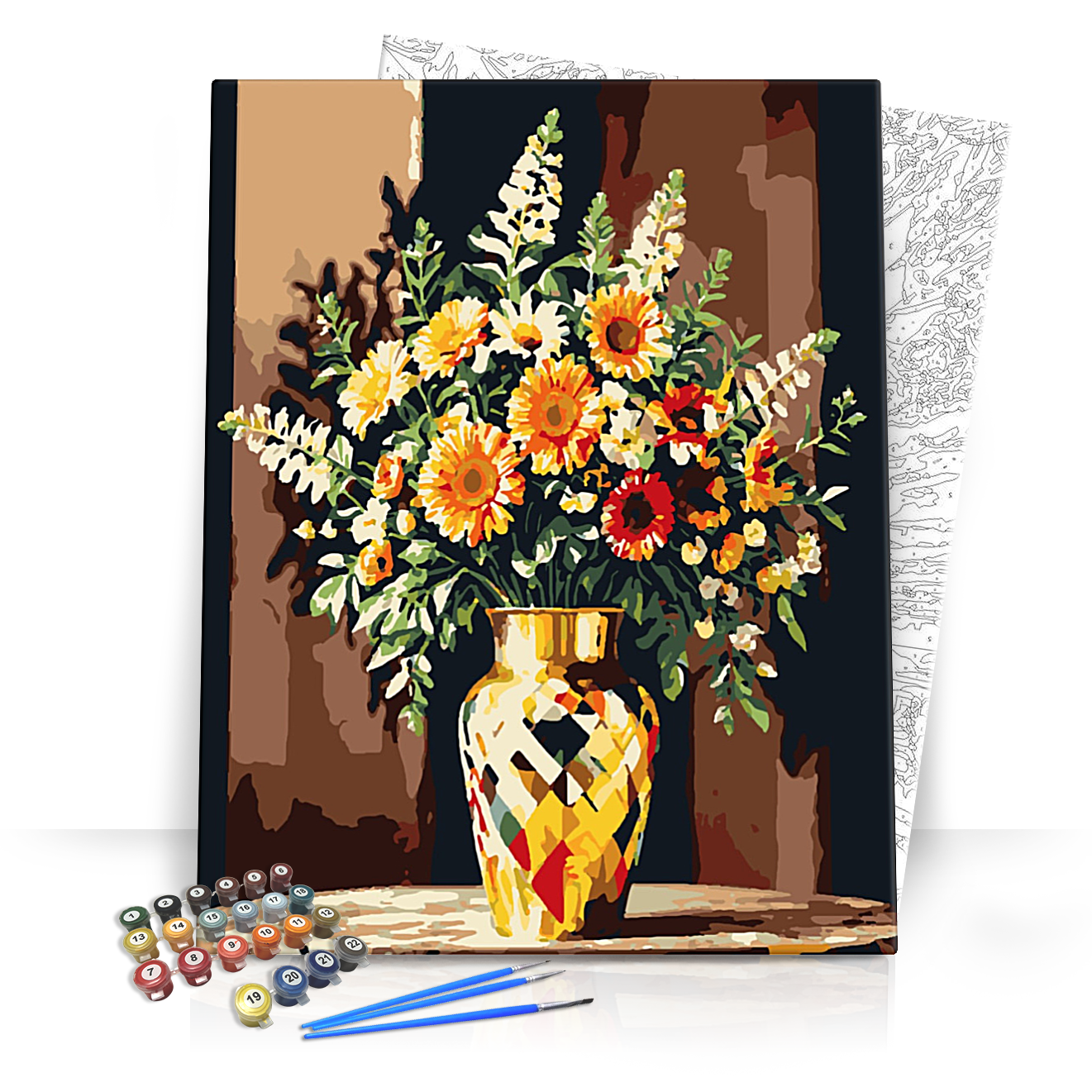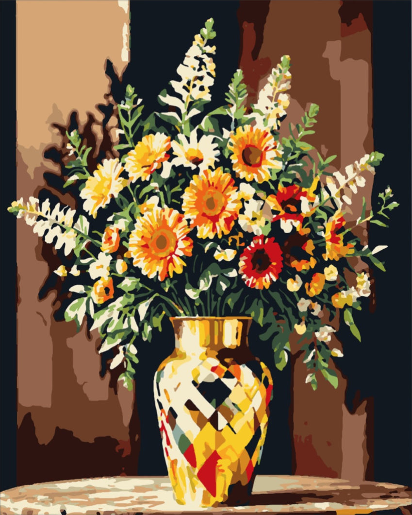 Fedezd fel a festés élményét az Aranyszín játék számfestő készlettel, mely egy csodálatos virágcsokrot ábrázoló festmény, tele életerővel és színek varázsával! A virágok élénk narancs és sárga árnyalatokban pompáznak, míg a háttér sötétebb tónusai kiemelik a kompozíció gazdagságát. A gyönyörű arany vázában elhelyezett virágok fénye és szépsége minden lakás ékessége lehet. Vidd haza ezt a festménykészletet, és engedd szabadjára kreativitásod!