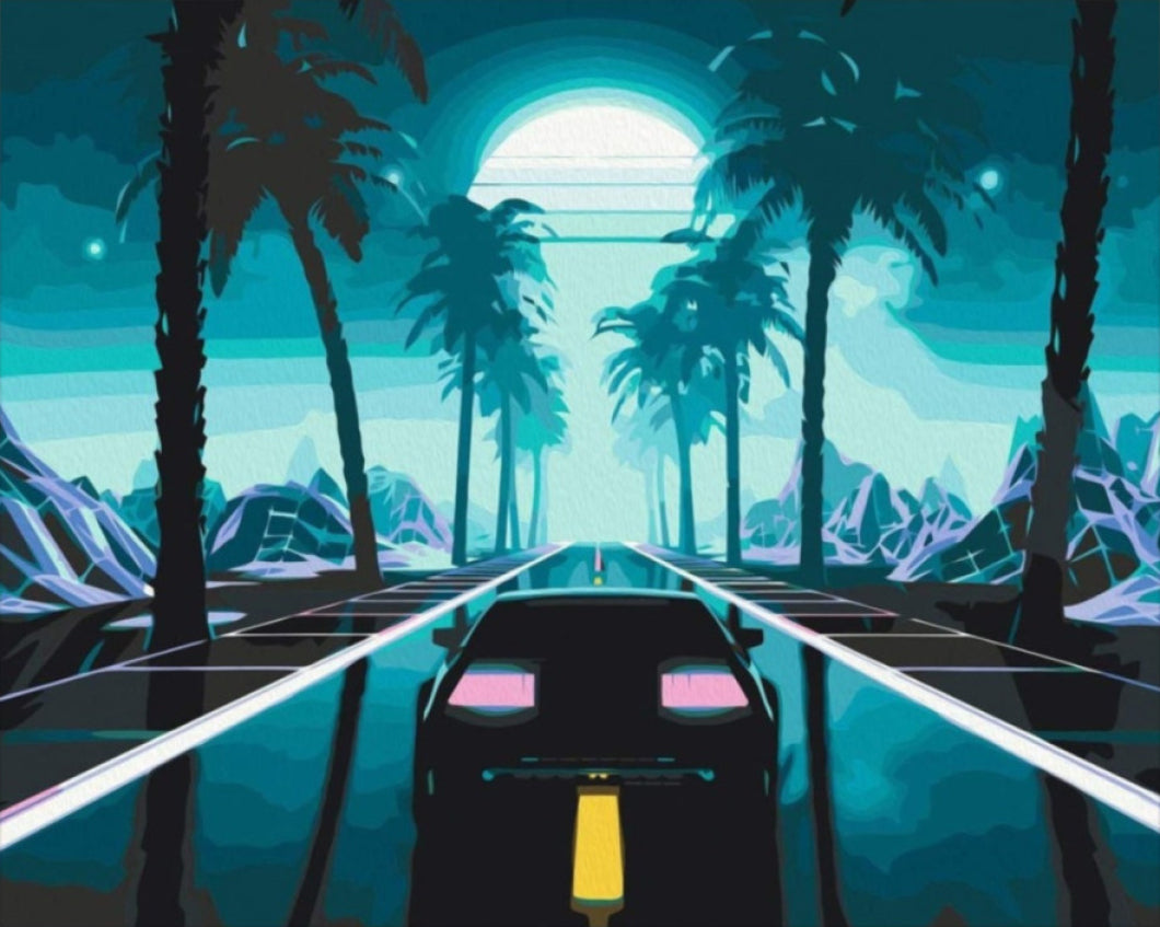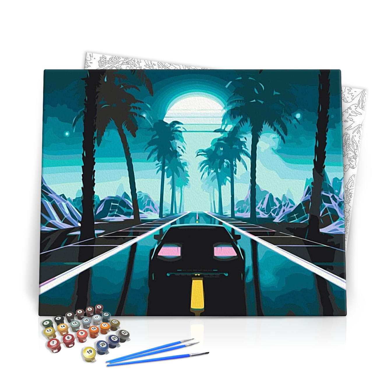 Merülj el a művészet világában ezzel a lenyűgöző számfestő készlettel, amely a szívhez szóló Autózás a Holdfényben témáját dolgozza fel! A futurisztikus tájban sűrű pálmafák állnak, miközben a romantikus, ezüstös holdfény megvilágítja az utat. A festmény egy különleges atmoszférát teremt, amely készen áll arra, hogy életre keltsd, akár tapasztalt művész vagy, akár kezdő.