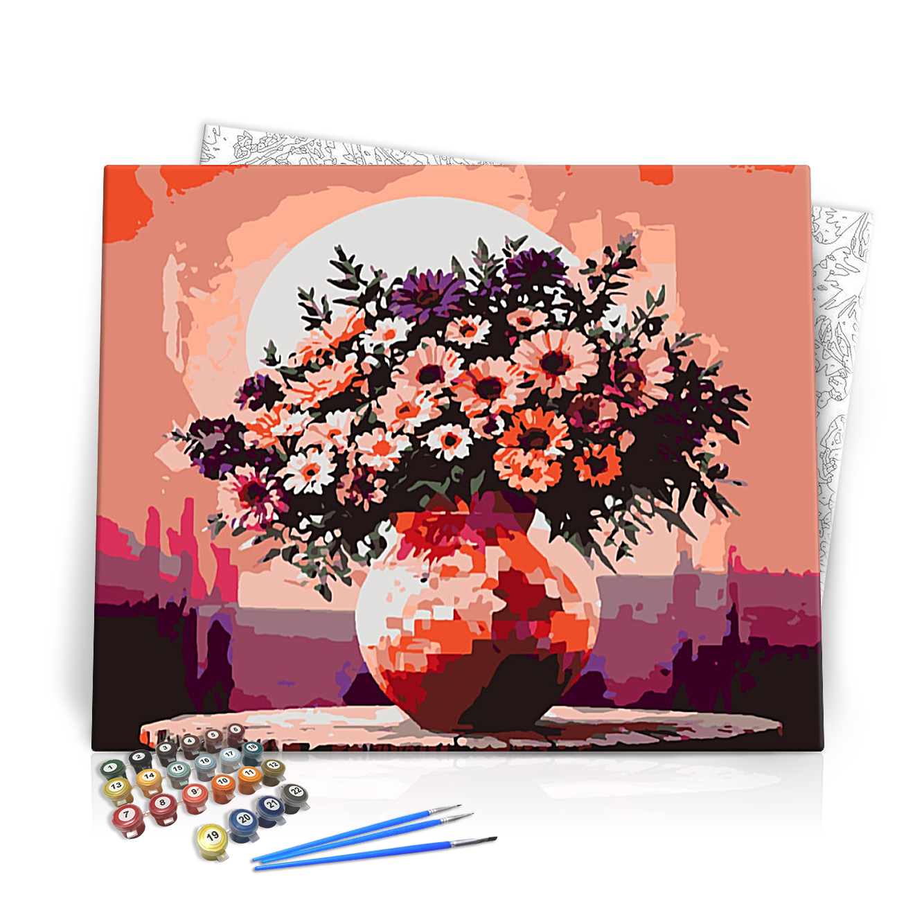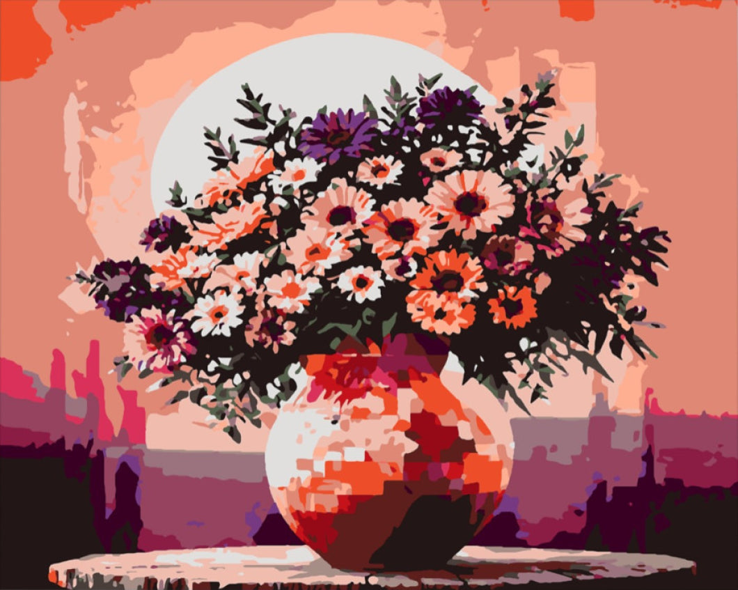 A kép egy nagy, gyönyörű virágcsokrot ábrázol, tele színes virágokkal, mint például fehér, narancs és lila árnyalatban pompázó margaréták, amelyek élettel töltik meg a teret. A vibrant harmonikus színek és a háttérben látható nagy, világító hold különleges légkört varázsol a kompozícióba. A kerek virágvázában helyet kapó növények egy ütős, stilizált formákkal és színátmenetekkel díszített világot idéznek, amely a festés során garantálja a sikerélményt.