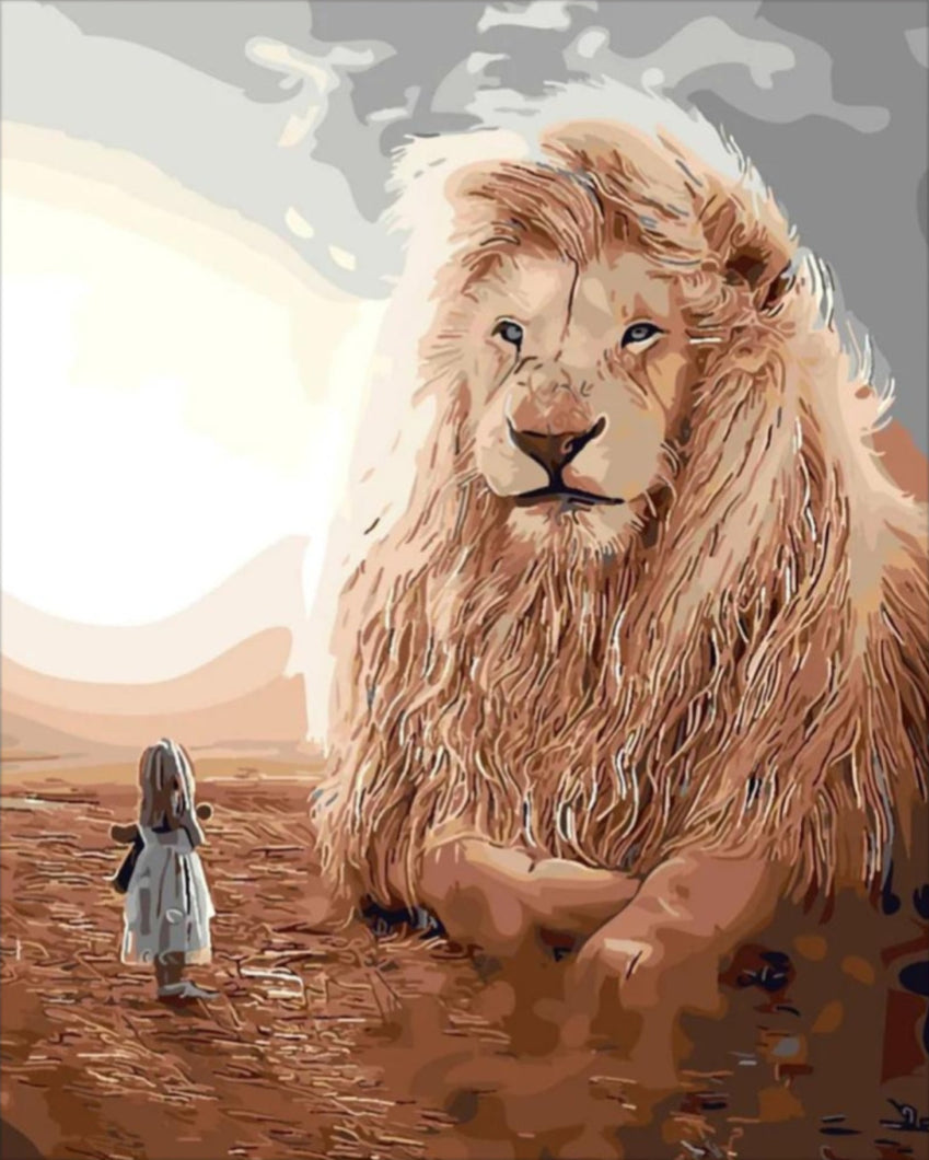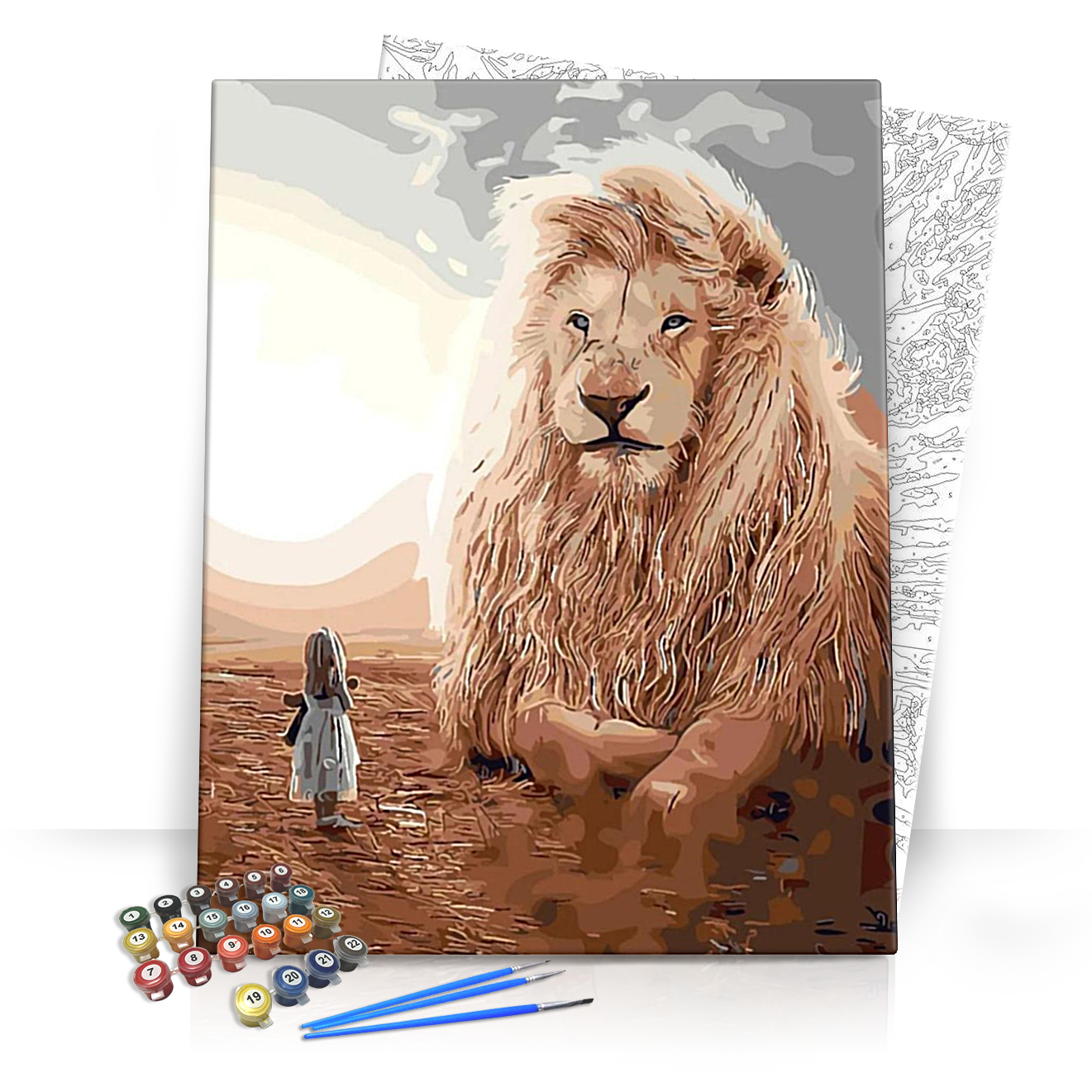 A készlet színes és részletes kompozíciója a meleg föld színekkel és az oroszlán bársonyos, aranyszínű bundájával emeli ki a varázslatos hátteret. Az elemek és színek harmonikus együttese lehetővé teszi, hogy mindenki, aki a festéshez kedvet érez, otthon is megalkothassa ezt a csodás képet.