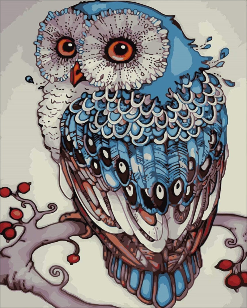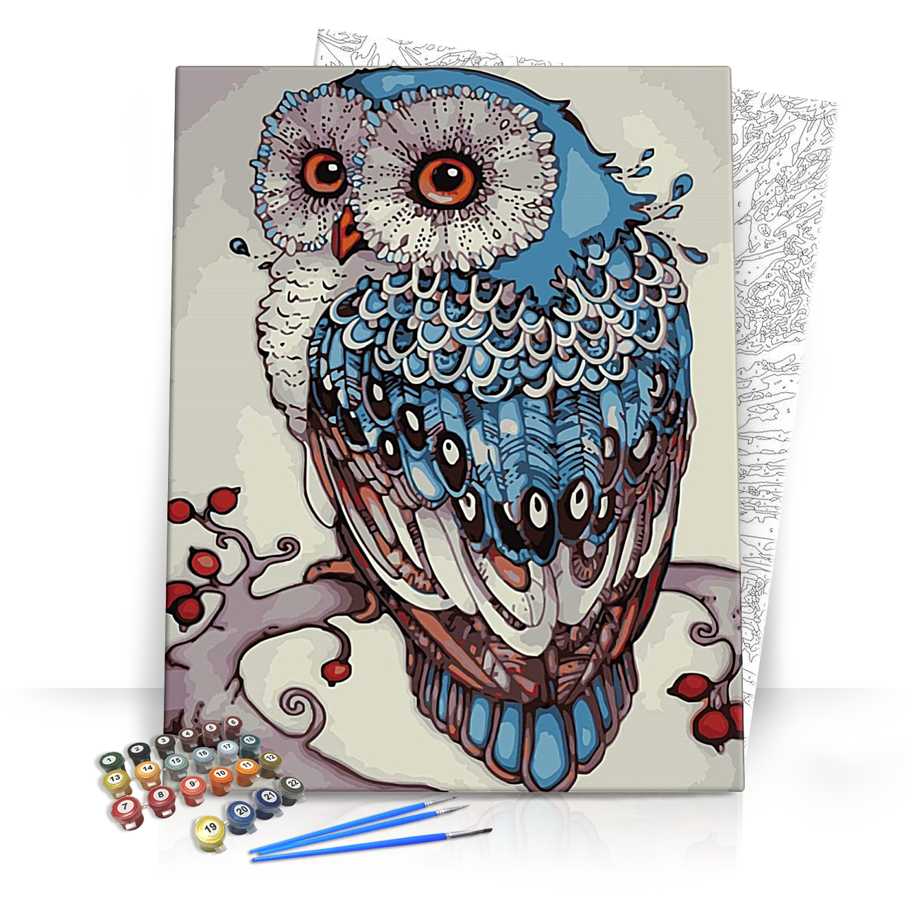 Fedezd fel a kreativitás világát a Bagoly - számfestő készlet segítségével! Ez a lelkesítő és színes festmény egy gyönyörű baglyot ábrázol, mely vidám kék árnyalatban ragyog. A részletesen kidolgozott kontúrok, a számokkal ellátott mezők és a lenyűgöző minták lehetőséget adnak arra, hogy még a kezdők is könnyedén a festés élményében részesüljenek.