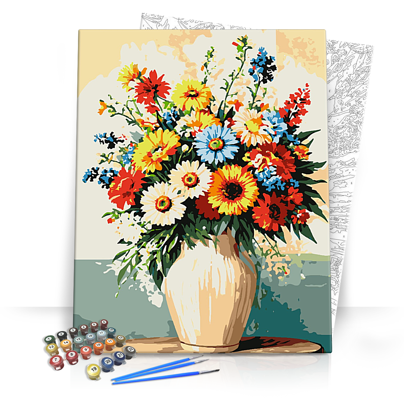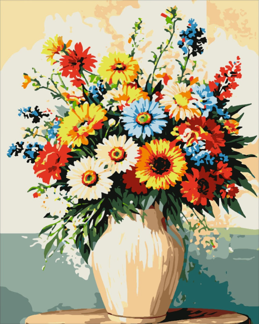 A képen látható virágok – napraforgók, margaréták és egyéb színes virágok – egy elegáns vázában helyezkednek el. A háttér lágy, világos árnyalatai kiemelik a virágok vibráló színét, így tökéletes színpadi keretet biztosítanak számukra. A kompozíció harmóniája és gazdagsága minden festőt inspirálni fog, függetlenül attól, hogy kezdő vagy tapasztalt művész.