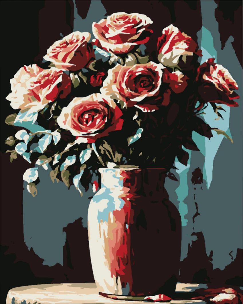 A festmény vízszintes elrendezésű, minden szála a figyelem középpontjába helyezi a rózsákat, melyek elegánsan egy vázában állnak. A háttér sejtelmes, sötétebb árnyalatú, ami kiemeli a virágok csodás színeit. Színekben gazdag kompozíció, amely az otthon bármely helyiségét megtölti élettel és harmóniával.