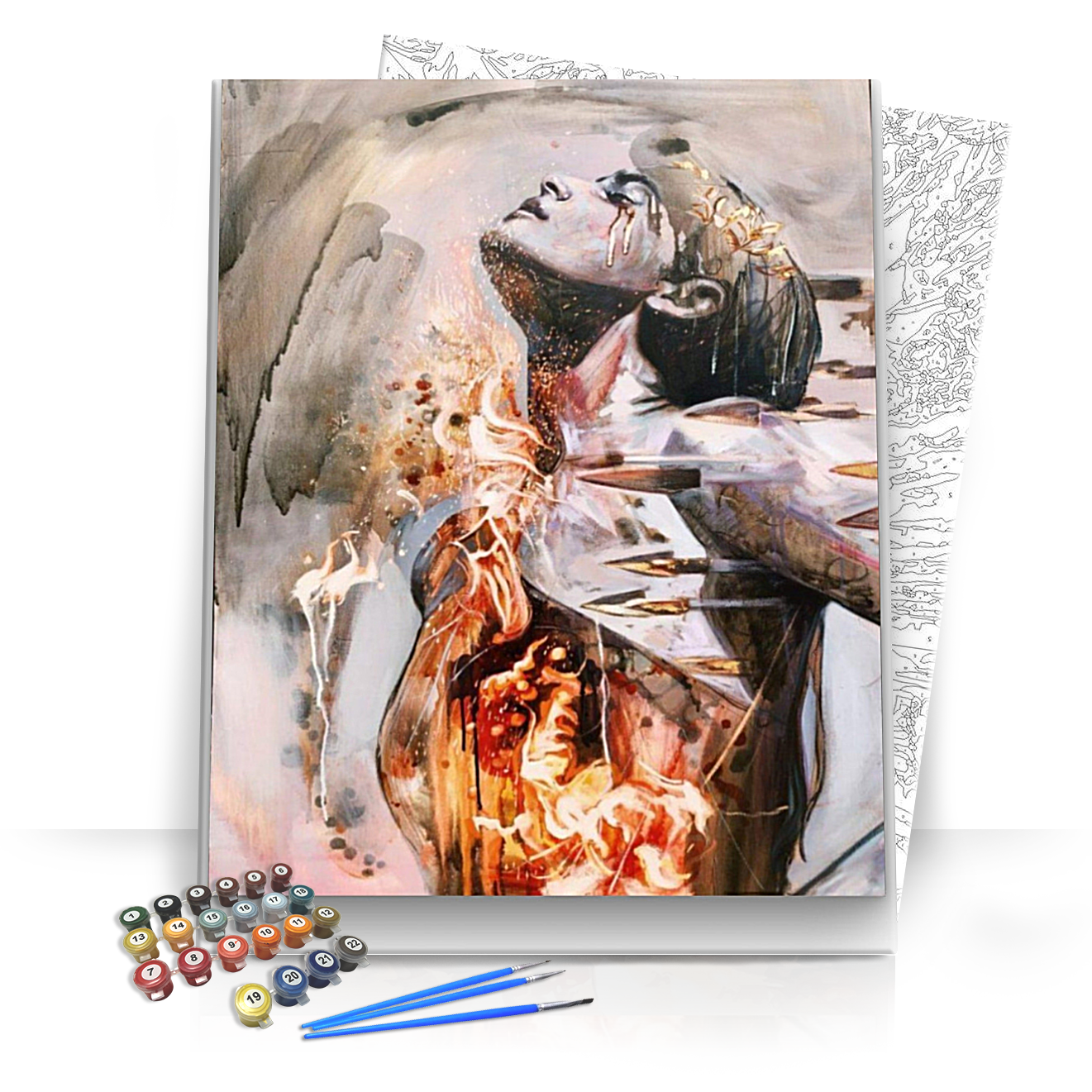 Merülj el a kreativitás tüzében a Belső tűz - számfestő készlet segítségével! Ez a lenyűgöző festmény egy erőteljes figura ábrázolását nyújtja, amely a színekkel és formákkal kifejezi az érzelmek széles spektrumát. Az emberi alak dinamikusan emelkedik ki a háttérből, amelyet lágy, lángoló tónusok és gazdag arany árnyalatok ölelnek körbe, mintha a belső lángjai éppen most gyulladtak volna ki. A festmény minden részlete kifejezi a szenvedélyt és a feszültséget, egy igazi mestermű, amely bármely falat feldobhat.