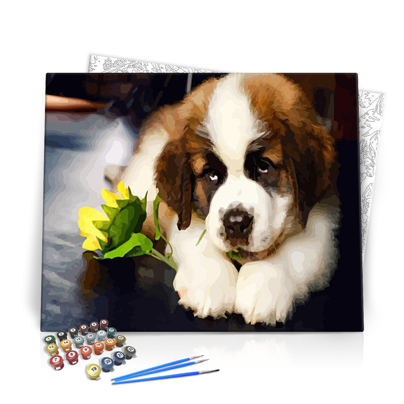 Engedd szabadjára a kreativitásodat a Bernáthegyi virággal számfestő készlettel, amely nemcsak a festés élményét nyújtja, hanem egy gyönyörű, szívhez szóló képet is varázsol otthonodba! A képen egy imádnivaló, barna-fehér Bernáthegyi kölyökkutya látható, amely egy színpompás virágot tart a szájában. Az állatka bájos tekintete és kifejező mozdulatai felébresztik benned a festői vágyat, miközben a virág élénk sárga és zöld színei különleges kontrasztot alkotnak a kutya puha, fehér bundájával.