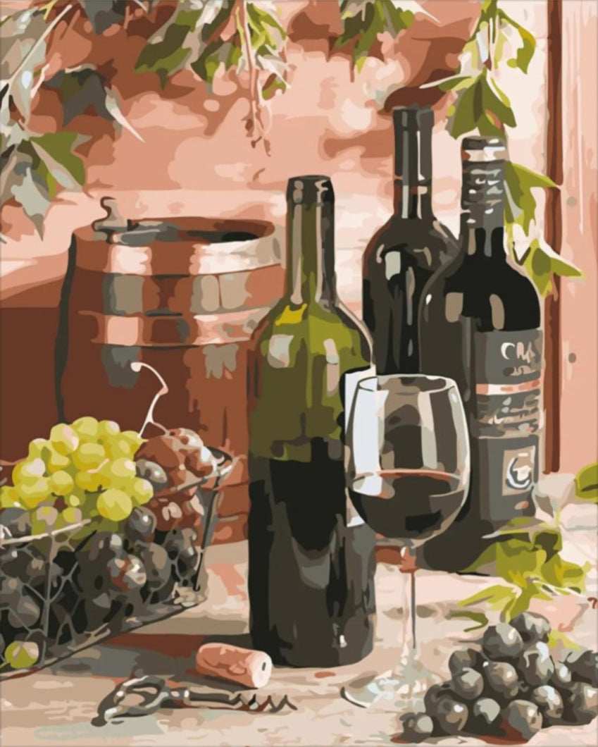 A műalkotás egy elragadó borkóstolót ábrázol, ahol az ínycsiklandó borosüvegek, a gazdag szőlőfürtök és az elegáns borospohár varázslatos összhangban állnak egymással. A színpaletta élettel teli, tele mély zöldekkel, érett lilákkal és barnás árnyalatokkal, melyek a természetes hangulatot erősítik.