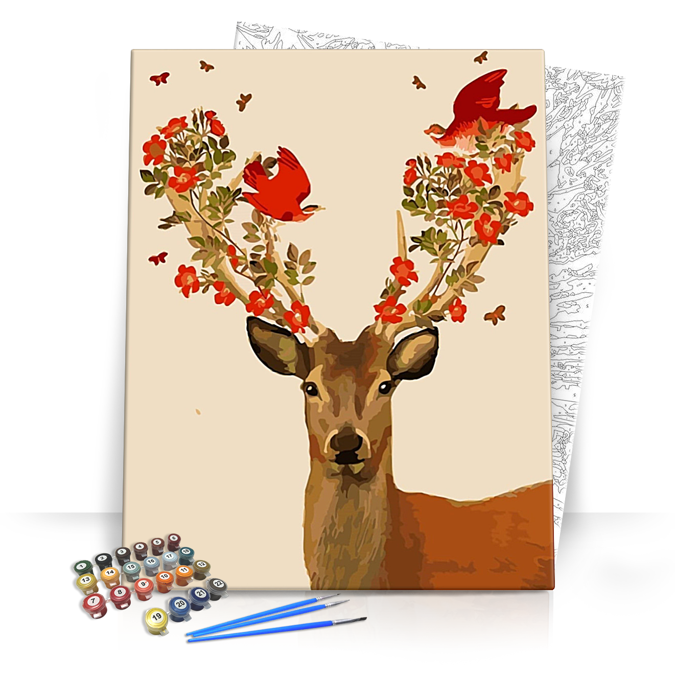 Engedje szabadjára kreativitását a Csodálatos Szarvas számfestő készlettel! Ez a látványos festmény egy varázslatos szarvast ábrázol, amelynek agancsai virágzó növényekkel díszítettek és élénkpiros madarak repkednek körülötte. A kép lenyűgöző elegyet alkot a természet szépségéből, a színek harmóniájából és a művészi kifejezésből. Ideális választás, ha szeretné egyedi, színes műalkotással díszíteni otthonát.