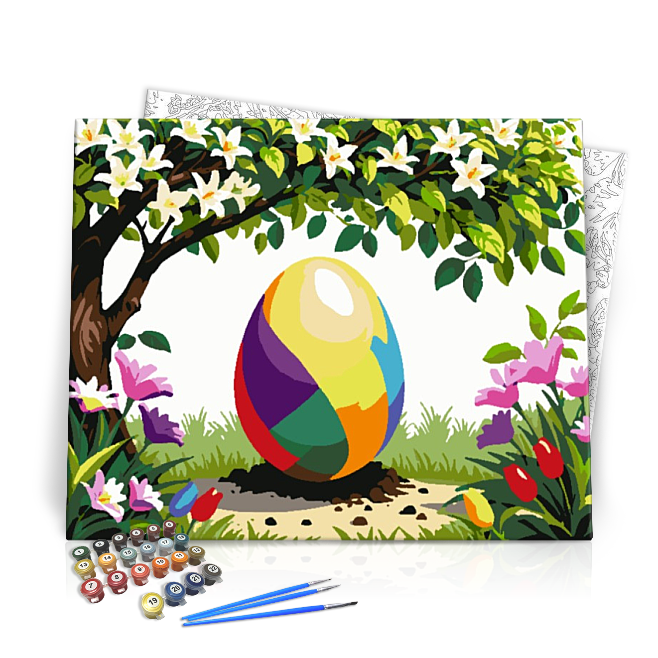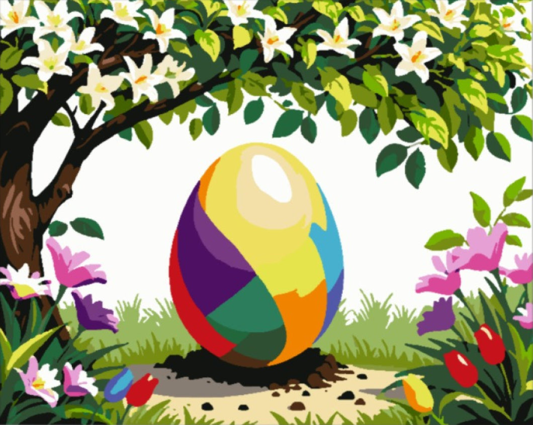 Üdvözöljük a kreativitás színes világában! A Díszes Tojás a Virágok Között húsvéti számfestő készlet tökéletes választás mindazok számára, akik szeretnék szebbé varázsolni otthonukat egy kis művészi mahóniával. A kép ábrázolása egy csodás, díszes tojást mutat be, amely a színes virágok között helyezkedik el, miközben a katángos fák lombjai felett szedett friss virágok díszítik a hátteret. A vibráló színek és a részletes design lehetővé teszi, hogy a festés valóban életre keljen!