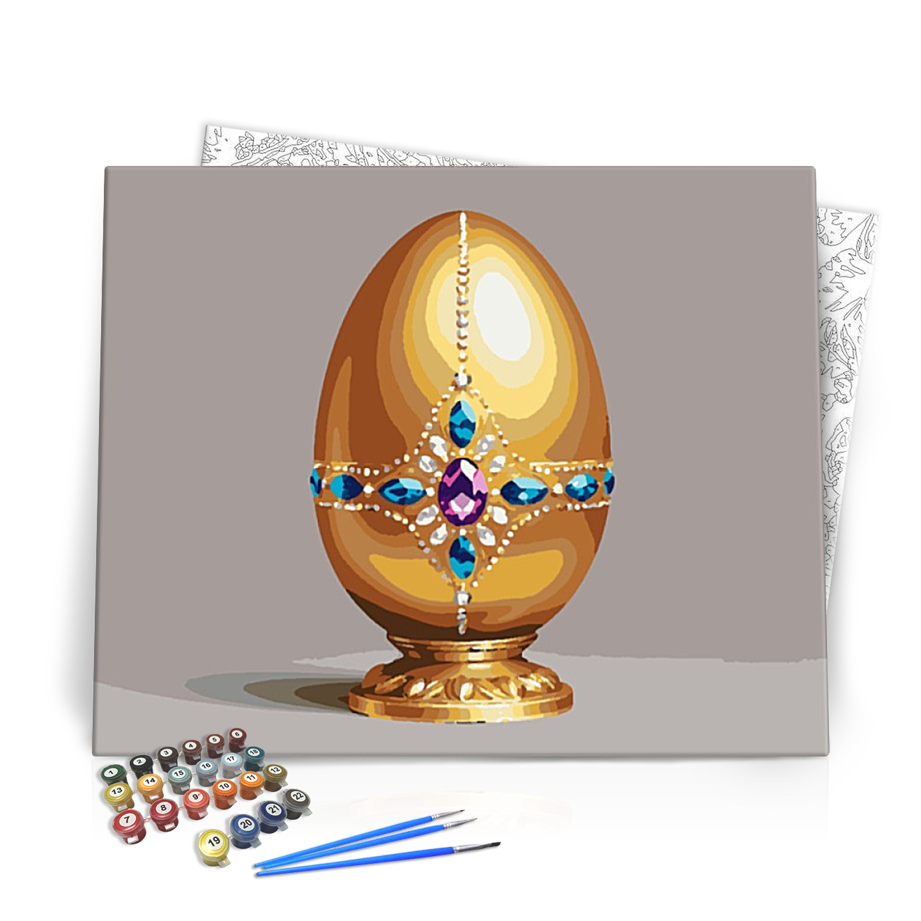 Engedje szabadjára kreativitását a Díszített Aranytojás számfestő készlettel! Ez a gyönyörű húsvéti motívum egy elegáns aranytojást ábrázol, melyet csillogó kék és rózsaszín drágakövekkel díszítettek. A fényes tojás, amely a részletes textúrák és modern grafikai elemek elegyével készült, tökéletes választás a tavaszi dekorációhoz és ajándéknak is. Az egyszerű, de mégis lenyűgöző háttér lehetővé teszi, hogy a tojás jelenjen meg a figyelem középpontjában, miközben a gyönyörű színek és formák harmonikus összefonódásával kápráztat el.