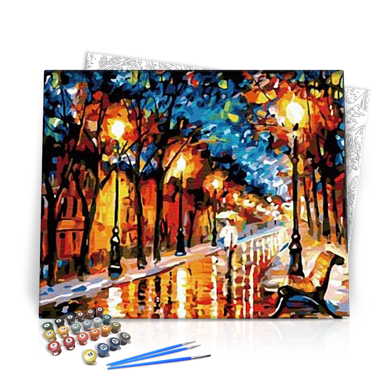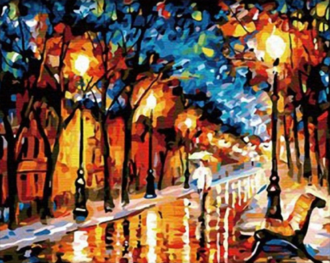 Merülj el a művészet világában és tapasztald meg az alkotás örömét a „Esti Séta az Esőben” számfestő készlettel! Ez a gyönyörű festmény a romantika és a nyugalom elegyét ábrázolja, ahol az utcák csillognak az eső után, miközben a lámpák meleg fényei beragyogják az estét. A festmény a látogatókat sétára csábítja egy varázslatos, eső utáni városban, ahol minden utca és fa idilli hangulatot teremt.