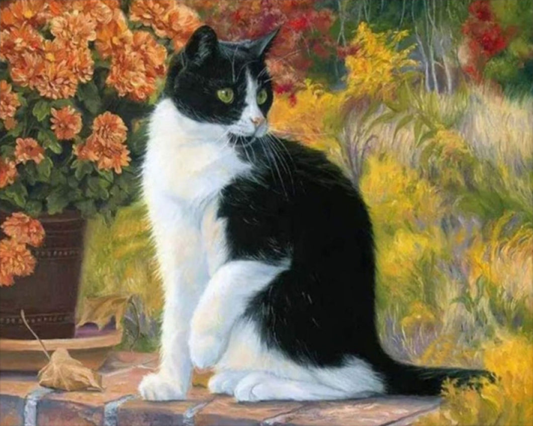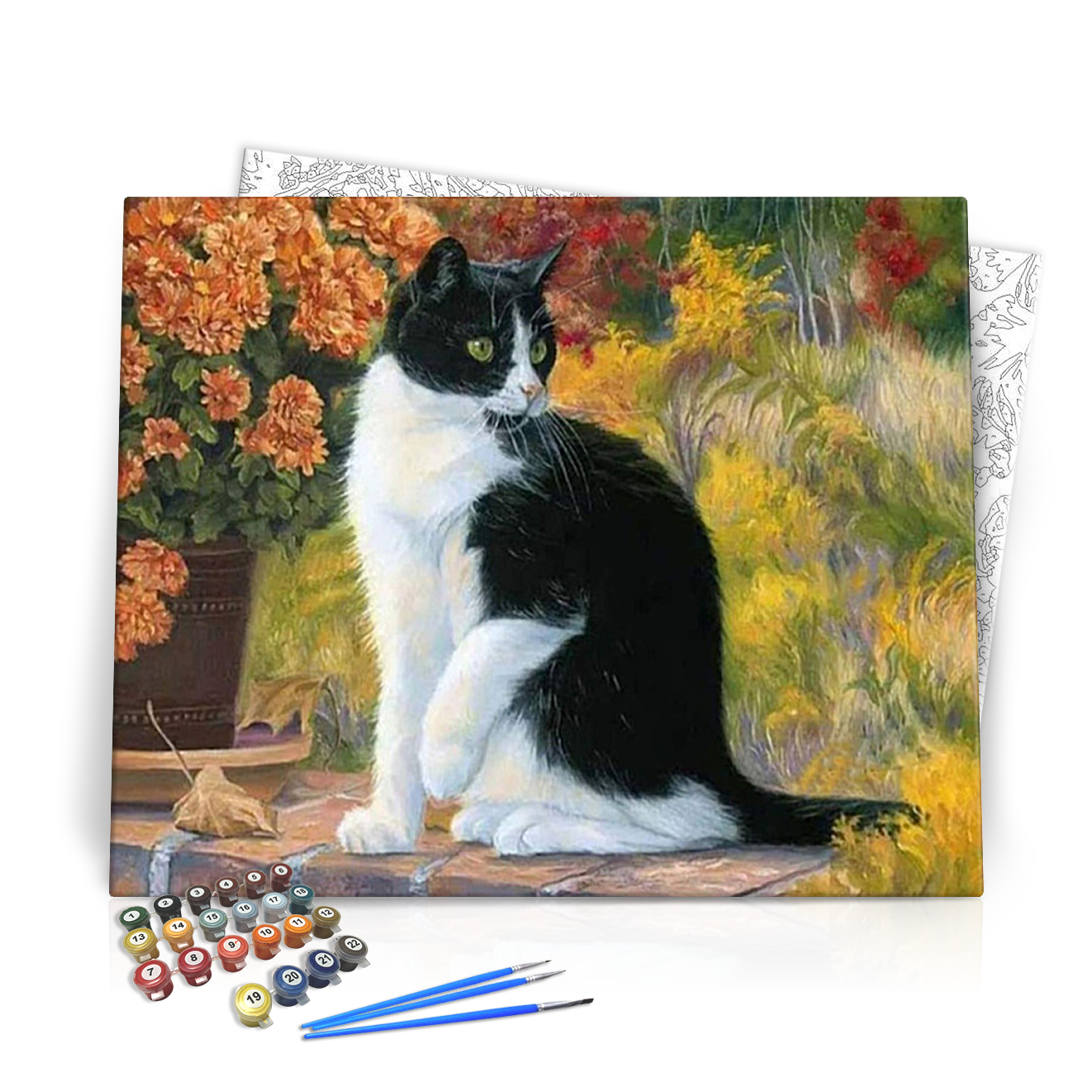 Fedezd fel a kreativitás új világát a Fekete Fehér Macska - számfestő készlettel! Ez a lenyűgöző festmény egy bájos fekete-fehér macskát ábrázol, amely egy színes virágkosár mellett ül. A természet lágy színei és a virágok vibráló árnyalataival kombinálva a kép élethűen tükrözi a csendes őszi délután nyugalmát. Elmerülhetsz a számokkal teli festés örömében, anélkül, hogy bármilyen előzetes festői tudásra lenne szükséged.