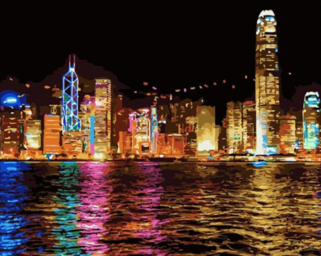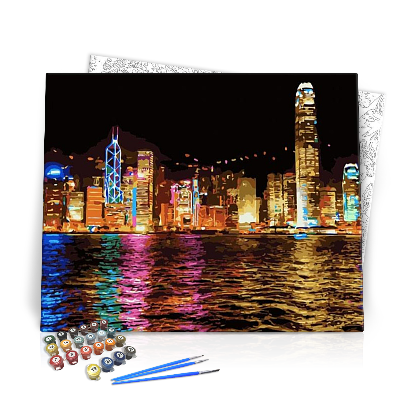 Merülj el a város fényeivel teli festmények világában a "Fényes város" számfestő készlet segítségével! Ez a készlet egy lenyűgöző éjszakai városképet ábrázol, ahol a modern felhőkarcolók ragyognak a sötét háttér előtt, a víz tükröződése pedig varázslatos színekkel tölti meg a kompozíciót. Az élénk színek, mint a kék, arany és pink, fantasztikus látványt nyújtanak, amely garantáltan elvarázsolja a festés szerelmeseit.