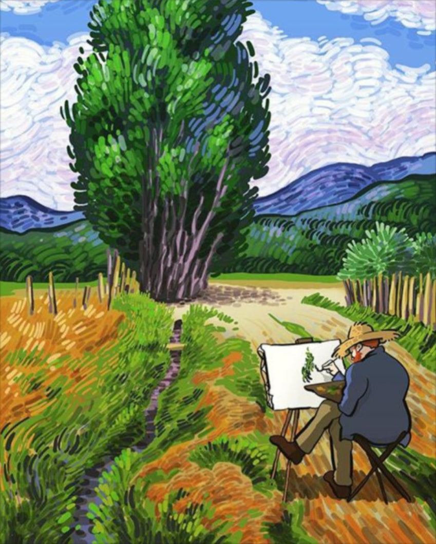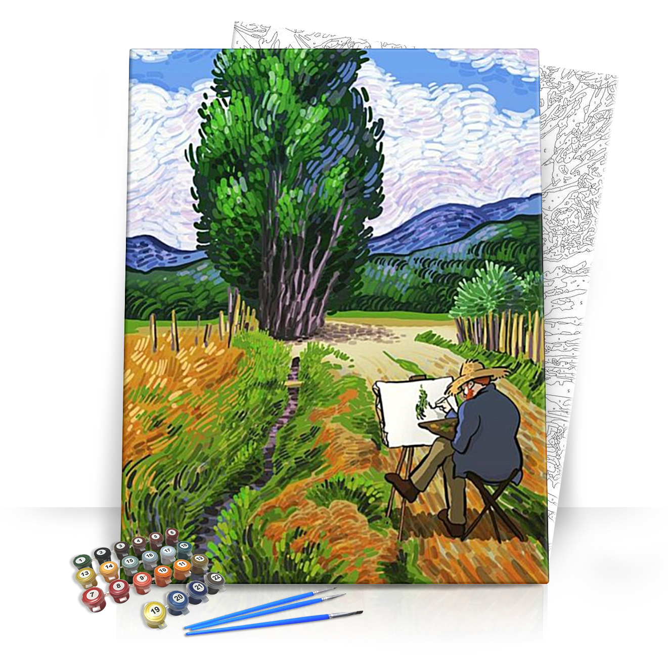 Merülj el a festés varázslatos világában a Festő - számfestő készlet segítségével! Ez a csodálatos kép egy gyönyörű tájat ábrázol, ahol egy művész a szabadban ül, és éppen alkot. A háttérben impozáns fák és dombok láthatók, míg a színpompás mezők vibráló színei teszik teljessé az élményt.