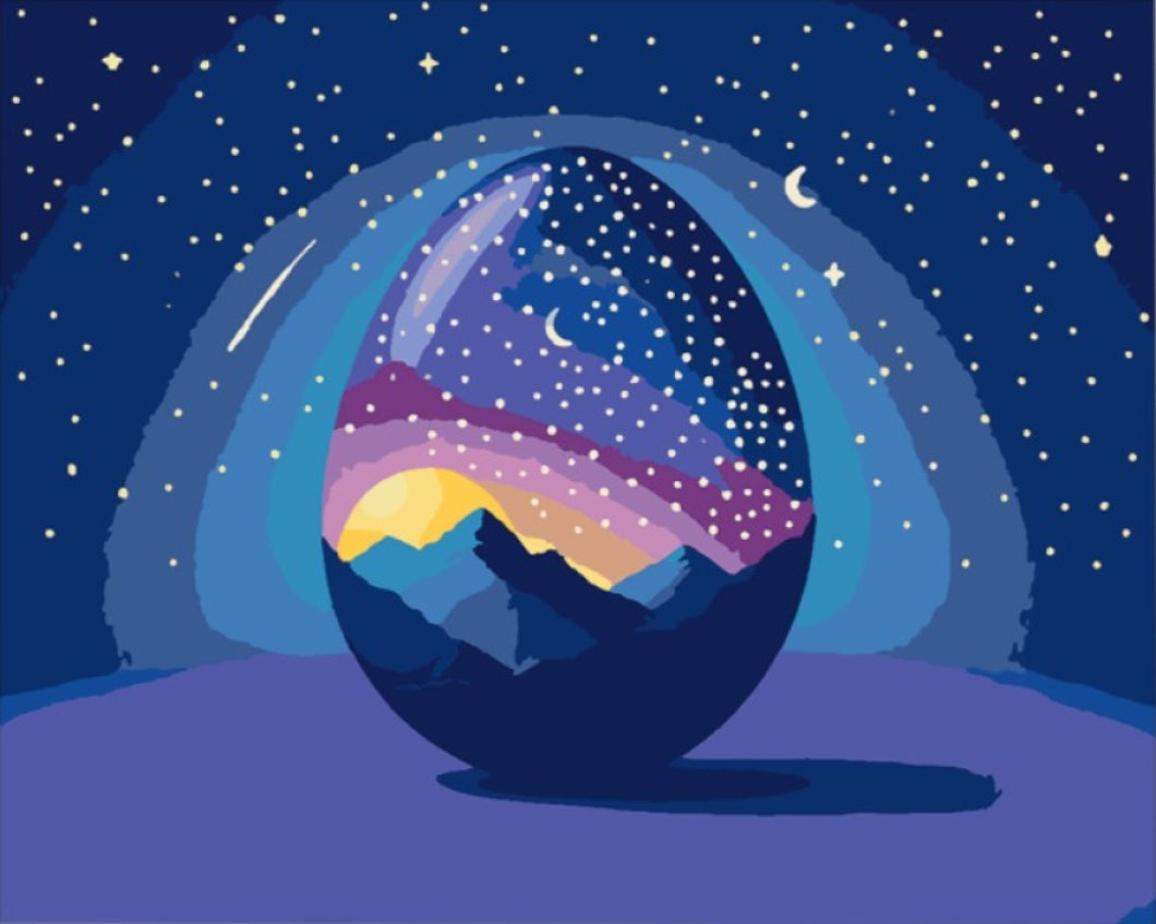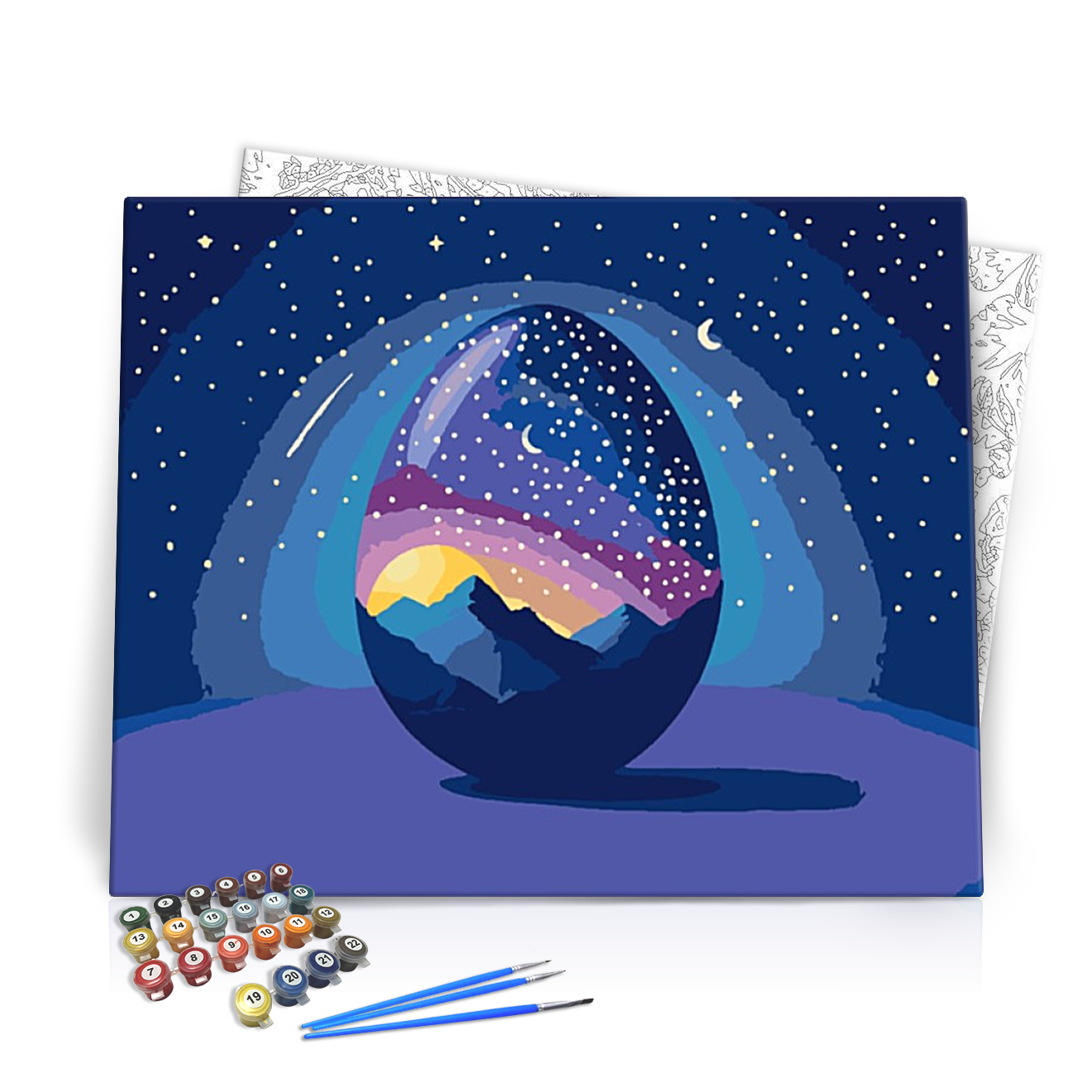 Merülj el a művészet varázslatos világában a Galaktikus Álom - húsvéti számfestő készlettel! Ez a lenyűgöző kép egy csillagfényes éjszakát ábrázol, ahol egy mesebeli tojásban gyönyörű hegyvidéki táj bontakozik ki. Az üveghatású tojás egyedi perspektívát ad az éjszakai égbolt csillagokkal teli világának, míg a vibráló színek, például a mélykék, lila és a sárgás árnyalatok melegséget és érzelmet sugallnak. Élvezd a művészi élményt, amely életre kelti a karácsonyi és húsvéti hagyományokat!