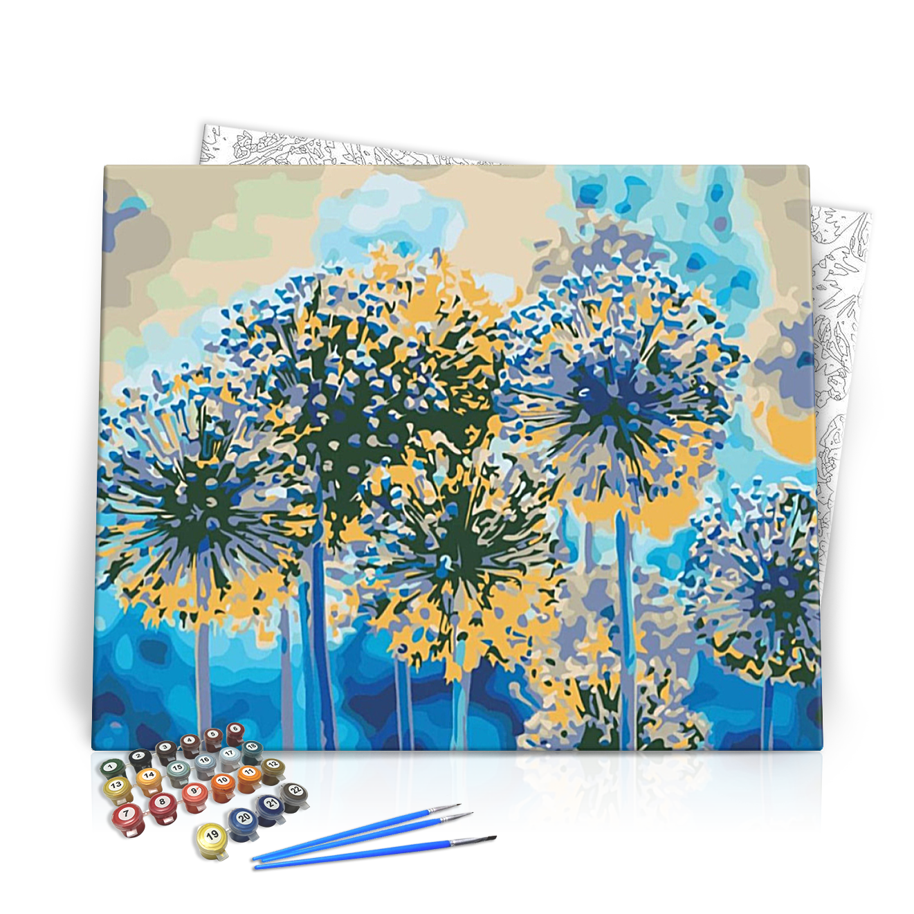 Fedezd fel a kreativitás világát a Gyermekláncfű számfestő készlettel, amely lehetőséget ad arra, hogy gyönyörű, színes virágos tájat varázsolj a vászonra! E képen a gyermekláncfű lágysága és vibráló színei megelevenednek, miközben a festés folyamata pillanatról pillanatra egyre izgalmasabbá válik számodra. Az elbűvölő kék és sárga színek találkozása, valamint a lebegő felhők és a napfény fénye csodás atmoszférát teremt, amely mindenki számára örömöt ad.