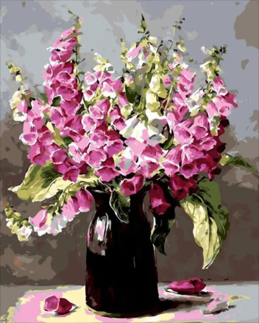 A csodálatos kompozíció egy dús, rózsaszín harangvirágokat tartalmazó csokrot ábrázol, amely egy elegáns fekete vázában kapott helyet. A virágok élethű színei és finom részletei magával ragadják a tekintetet, miközben a háttér és a váz szakszerűen kidolgozott árnyalatai tökéletes kontrasztot alkotnak a virágokkal. A festmény mindenki számára élvezetes élményt nyújt, hiszen a kellemes és vidám színek a természet szépségét idézik meg.