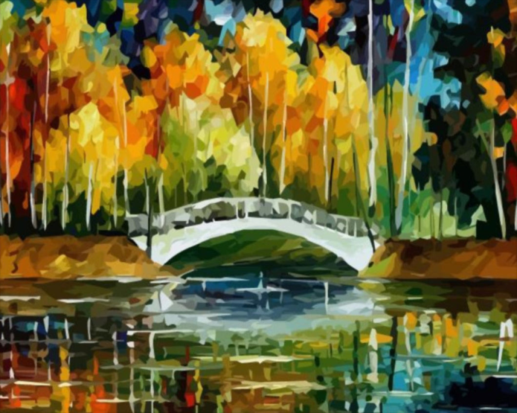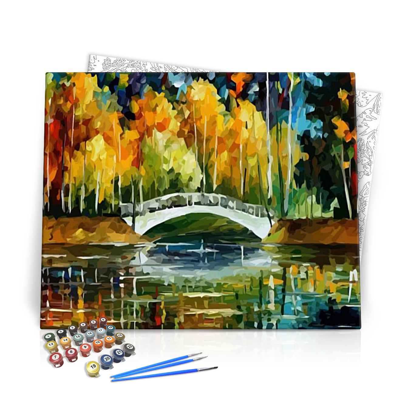 A festmény középpontjában egy elegáns híd áll, amely a nyugodt víz fölött ível át, körülötte pedig a fényes, őszi fákkal borított part látványa. A kép atmoszférája békés, harmonikus, ami segít elmerülni a festés örömében. A festés során a számozott mezők és kontúrvonalak biztosítják, hogy még a legkevesebb tapasztalattal rendelkező művészek is könnyedén reprodukálják ezt a meseszép tájat.