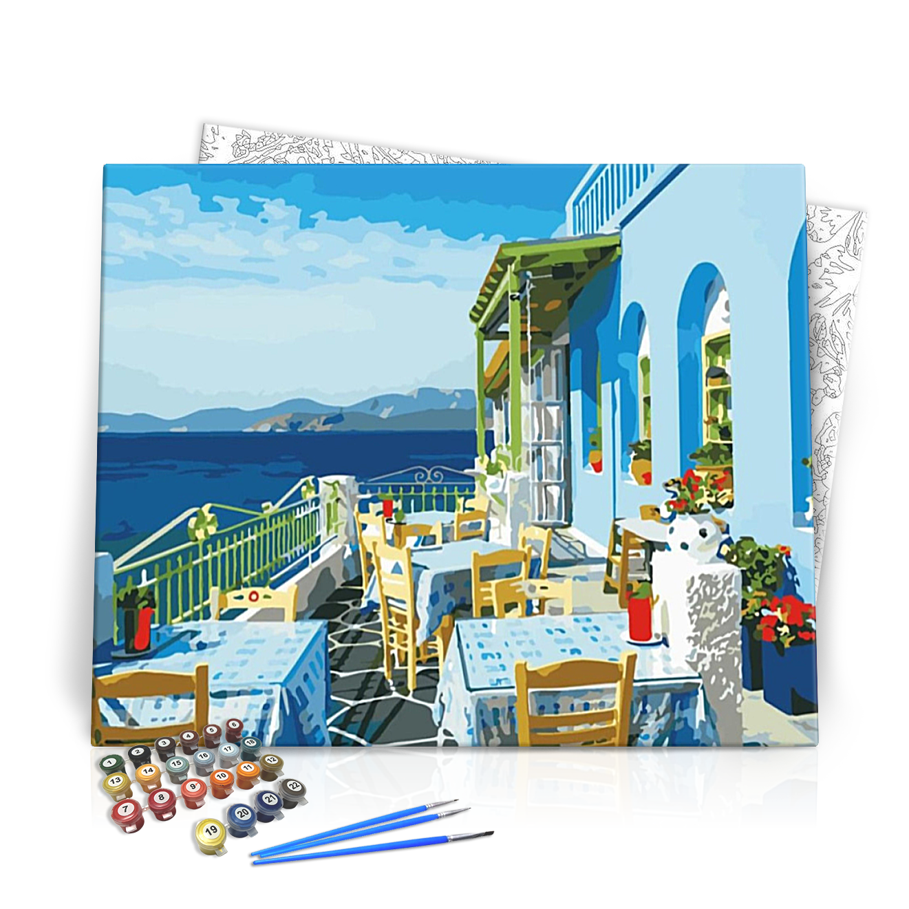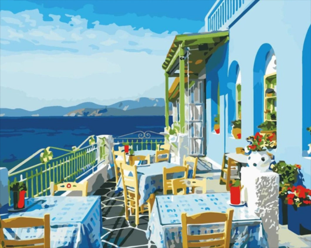 Fedezze fel a mediterrán varázslatot a Hullámzó kilátás számfestő készlettel! Ez a gyönyörű készlet lehetővé teszi, hogy saját kezűleg varázsolja elképzeléseit a vászonra, miközben élvezi a festés örömét. A kép egy napfényes tengerparti étterem teraszát ábrázolja, ahol kék árnyalatok és vibráló színek találkoznak a tenger és a növények szépségével. A háttérben a csillogó tenger és a messzi hegyek látványa nyugalmat áraszt, a teraszon pedig falatozó, vidám hangulatban ücsörgő vendégek köszöntik a napot.