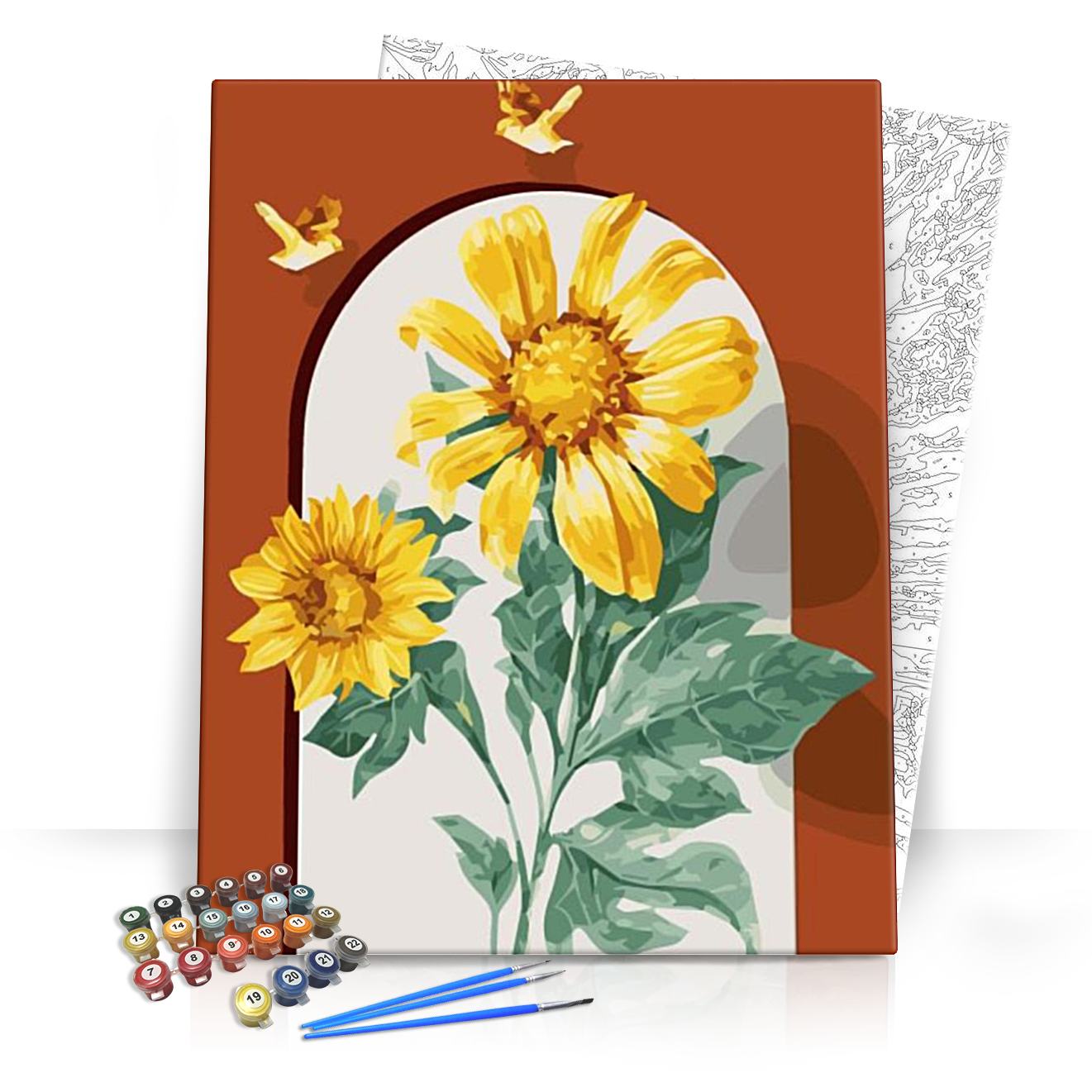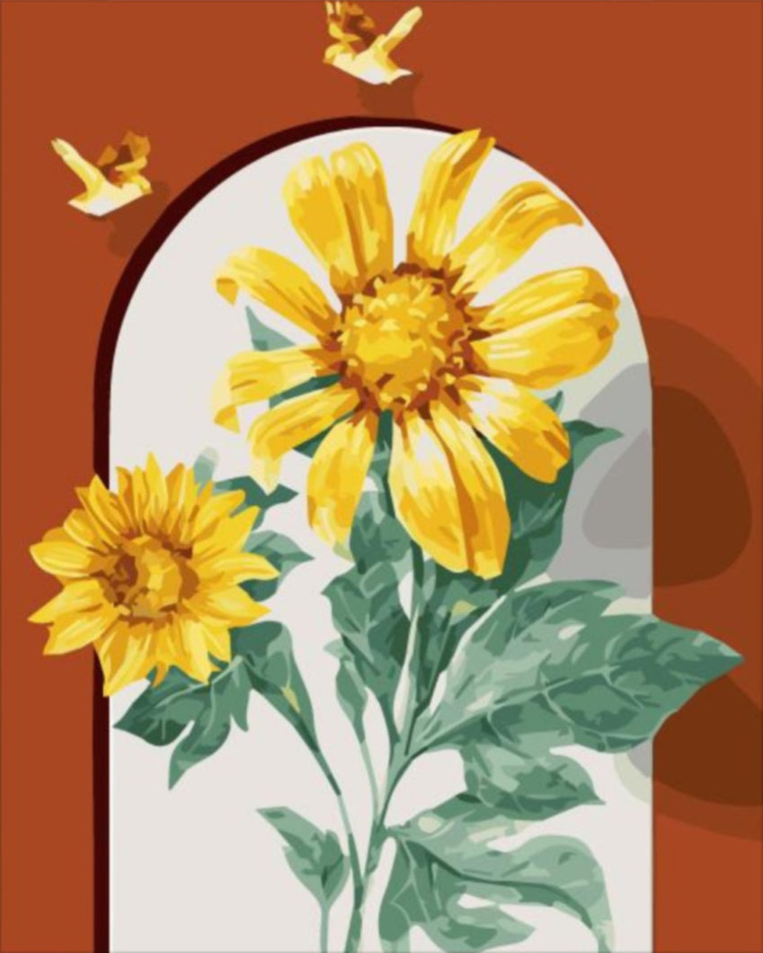 Fedezd fel a festészet varázsát a Hulló virágszirom számfestő készlettel! Ez a gyönyörű kép egy napsütéses színű napraforgót és barátságos zöld leveleket ábrázol, háttérben légiessé varázsolva a pillanatot néhány színes madárral. Az élénk sárga és zöld színek csodálatos kontrasztban állnak a meleg vörös háttérrel, amely egyedülálló hangulatot teremt a helyiségben. A kép stílusa modern, mégis természetközeli, ideális választás a festészet kedvelőinek.