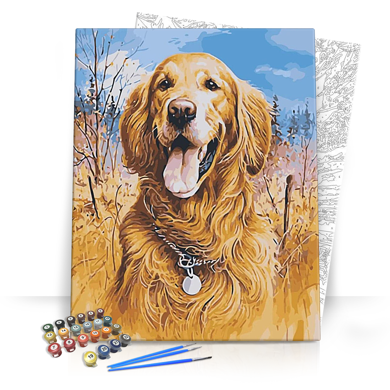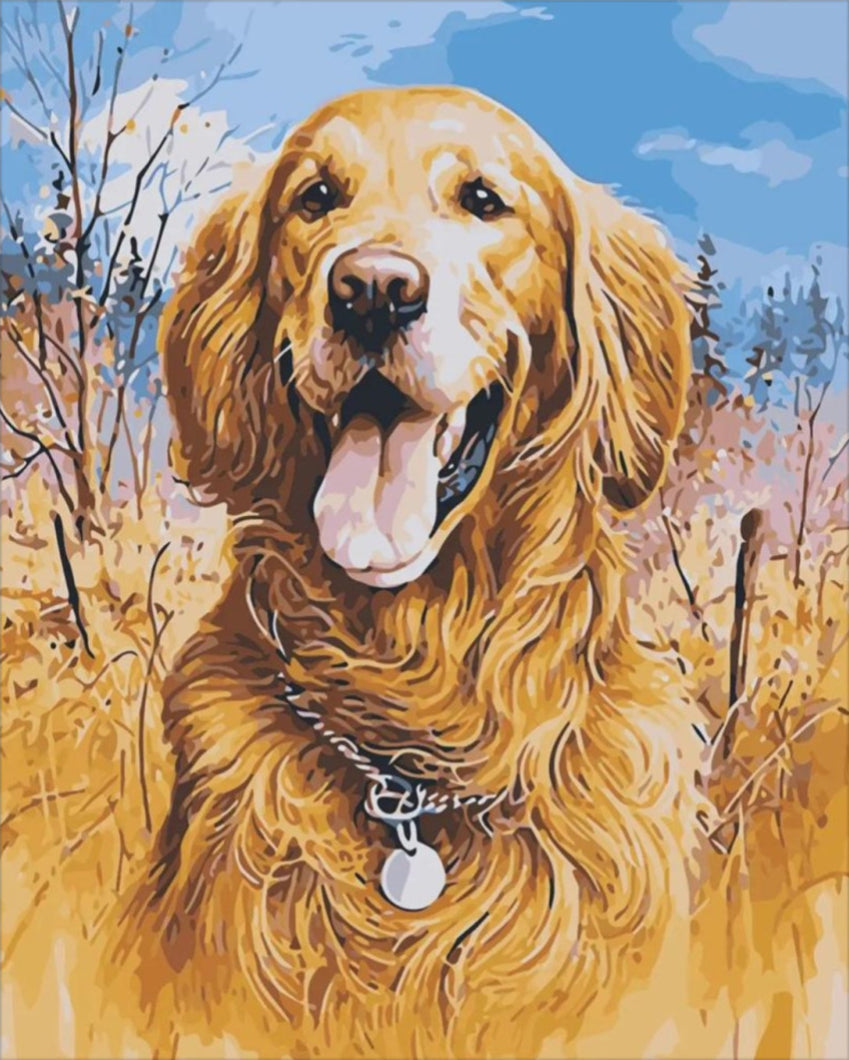 Fedezd fel a festés örömét a Hűség számfestő készlettel, amely tökéletes választás mindazok számára, akik szeretnék kreatív tehetségüket kibővíteni! Ez a festői mintázat egy boldog golden retriever mosolygós arcát ábrázolja, amely felüdít és jókedvre derít mindenkit. A napos égbolt és az aranyló barna színű bundája mesés kontrasztot alkot a háttérben található természetes tájjal.