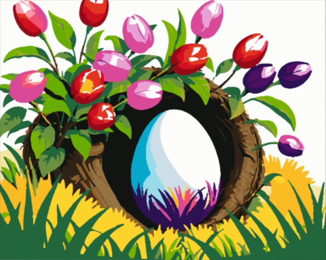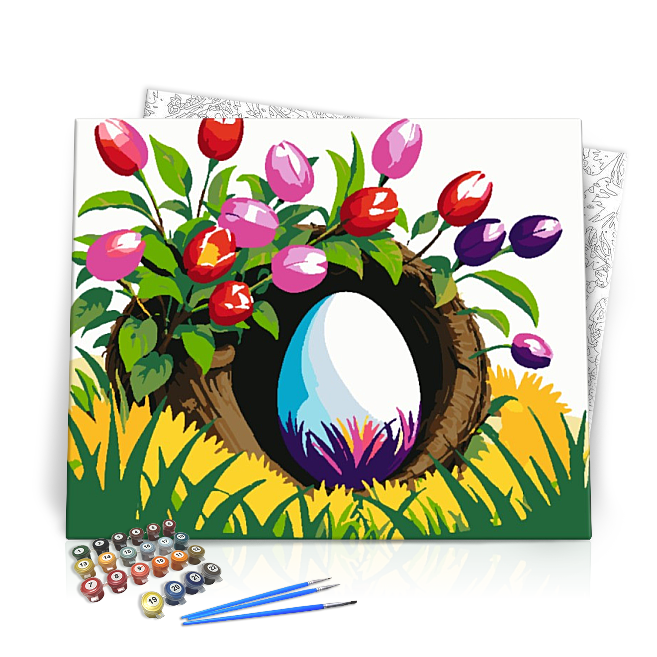 Ünnepelje a Húsvét varázsát a Húsvéti Dekoráció - húsvéti számfestő készlet segítségével! Élvezze a kreatív alkotás örömét a csodás tavaszi tájat megjelenítő festménnyel, amely egy színes virágkoszorú tövében megbúvó tojást ábrázol. Az élénk tónusok és a részletgazdag elemek garantálják, hogy mindenki számára örömet okoz majd a festés folyamata.