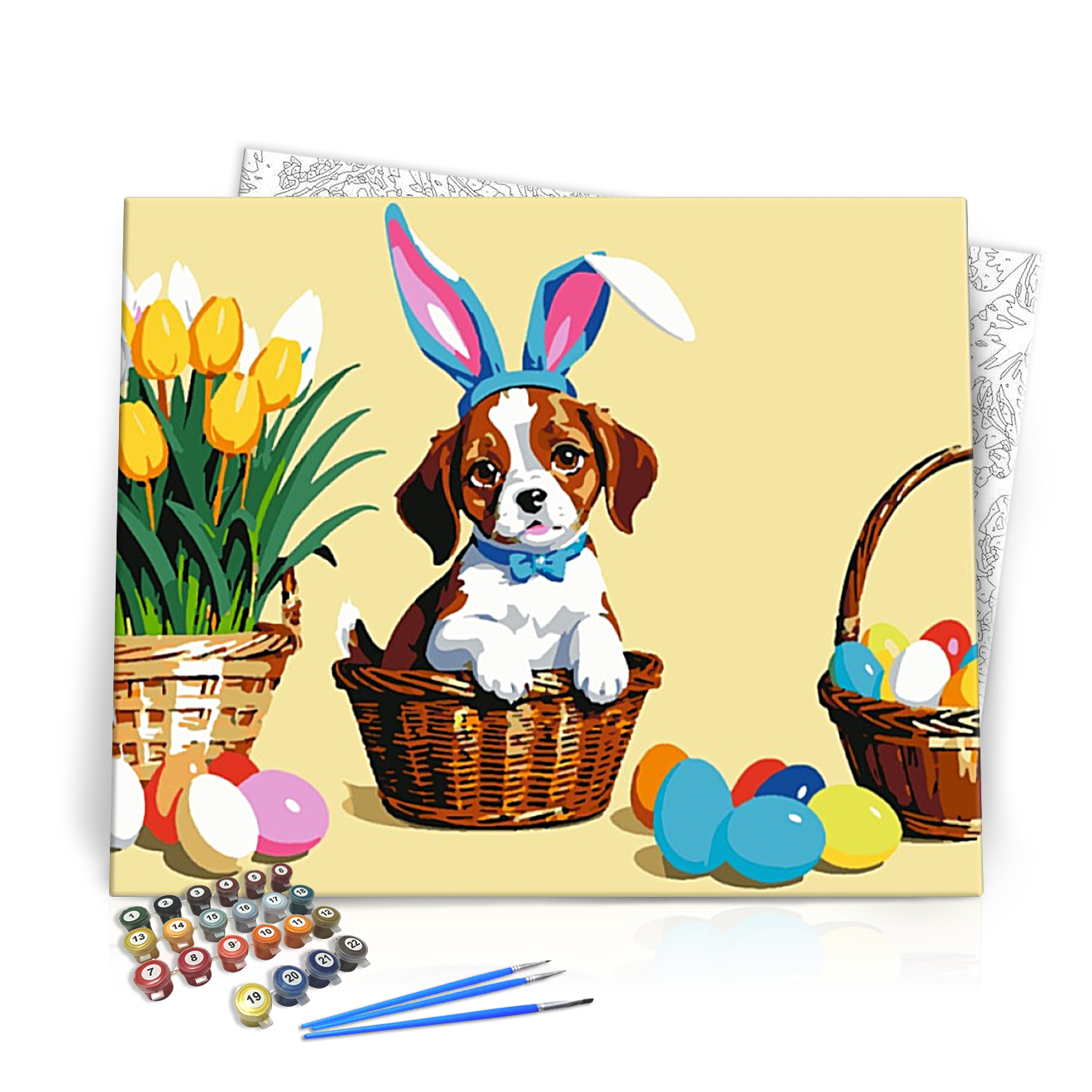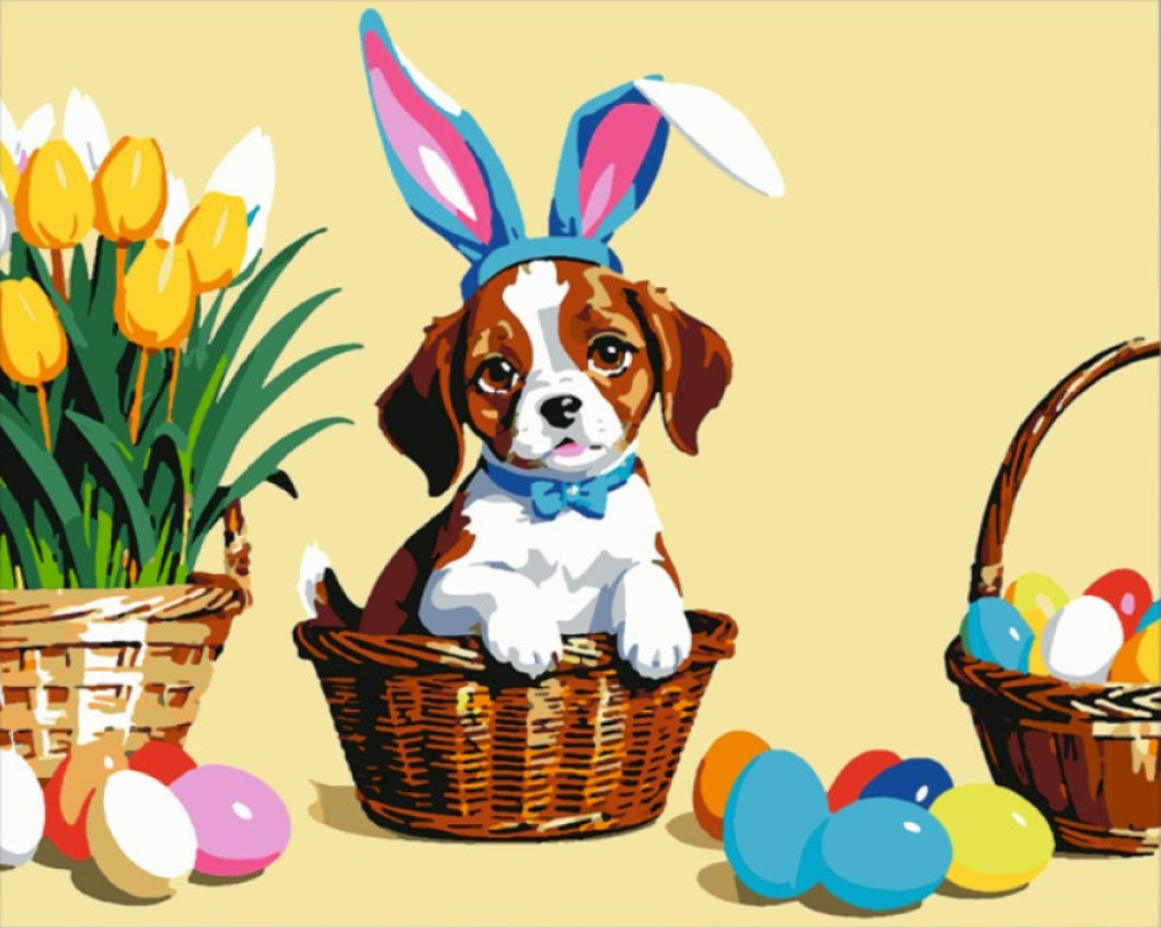 Ünnepelje a tavasz varázsát a Húsvéti Hangulat számfestő készlettel! Ez a bájos festmény egy aranyos kis kutyust ábrázol, aki húsvéti nyuszifülekkel díszítve ül egy kosárban, körülvéve színes tojásokkal és tavaszi tulipánokkal. A hátteret egy vidám, világos sárga szín adja, ami még inkább kiemeli a kép boldog, ünnepi hangulatát.