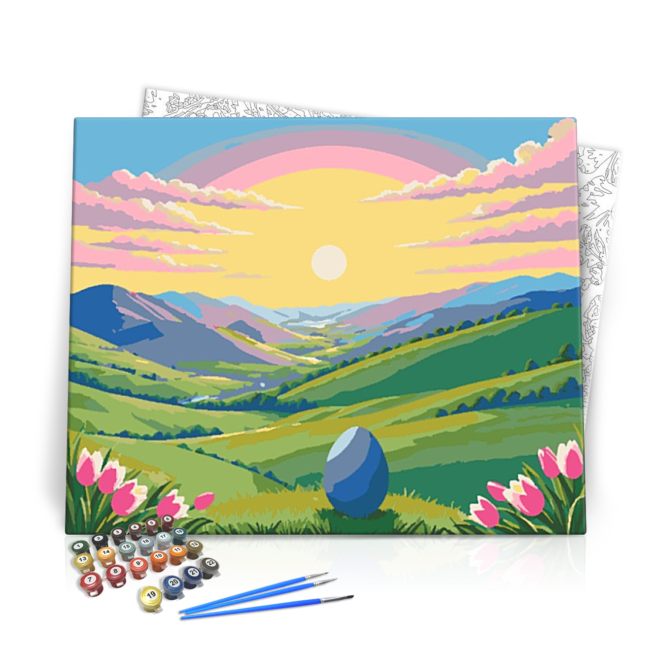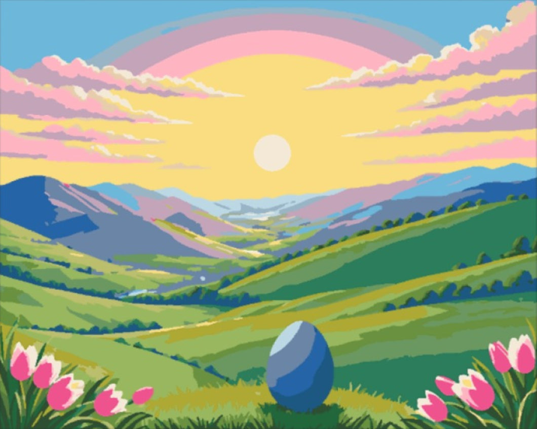 Merülj el a tavasz frissítő szépségében a Húsvéti Panoráma számfestő készlettel! Ez a lenyűgöző táj, amely a színes, virágzó rétekkel és egy gyönyörű, kék tojással vár rád, tökéletes választás ahhoz, hogy megéléseket csempéssz a festés csodálatos művészetébe. A napsugarak és a derengő, színes felhők varázslatos atmoszférát teremtenek, amely segít egy varázslatos húsvéti hangulat megteremtésében.