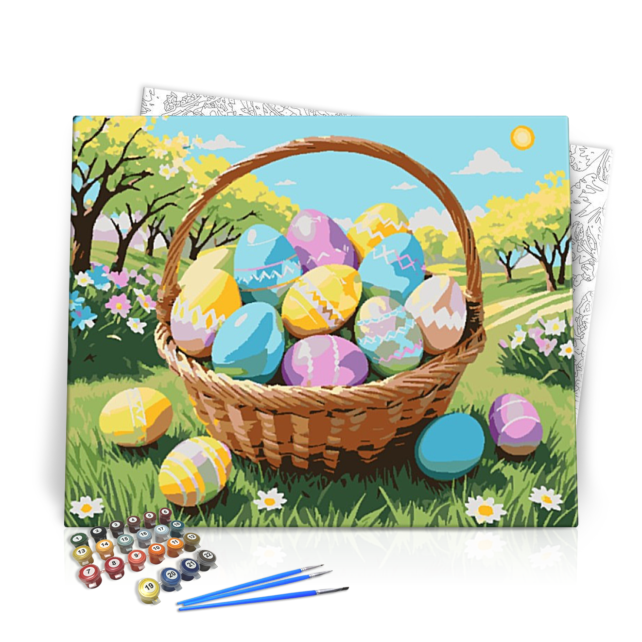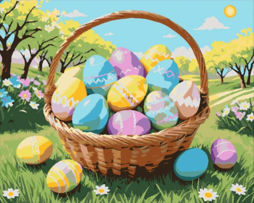 Ünnepeld a húsvéti időszak varázsát ezzel a lenyűgöző, élénk színű számfestő készlettel! A Húsvéti Tojás Kosár festménye tele van színes tojásokkal, virágzó rétekkel és ragyogó napfénnyel, hogy egy igazán örömteli hangulatot kölcsönözzön otthonodnak.