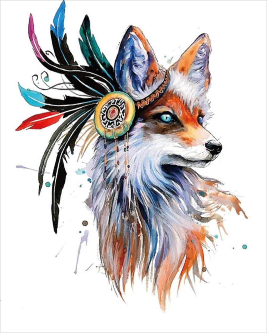 A kép középpontjában egy színes, erős karakter áll, gyönyörű, élénk kék szemekkel és gazdag, vöröses-barnás bundával. A róka elegáns fejdísze, amelyet színes tollak díszítenek, még inkább fokozza a kép varázsát. Az akvarellek lágy vonalainak és a ragyogó színek játékának köszönhetően, egyedi és megkapó műalkotást hozhatsz létre. A tervezett kontúrvonalak és a számozott mezők megkönnyítik a festést, így bárki, aki kézbe veszi, biztosan sikerélménnyel tér haza.