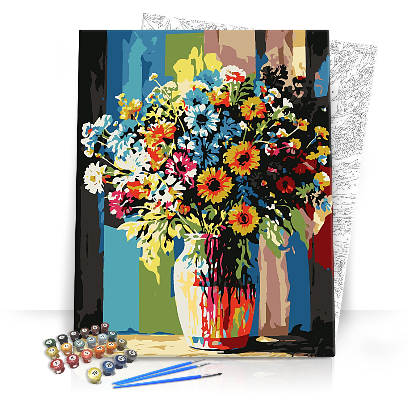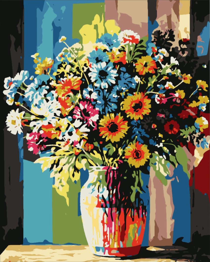 A kép bemutat egy bőséges virágcsokrot, mely tele van színes virágokkal – narancssárga, kék, fehér és zöld árnyalatok keverednek, miközben a háttér patinás falai még inkább kiemelik a virágok szépségét. Az apró részletek és a kontúrvonalak révén mindenki számára élvezhető és könnyen követhető festési élmény vár!