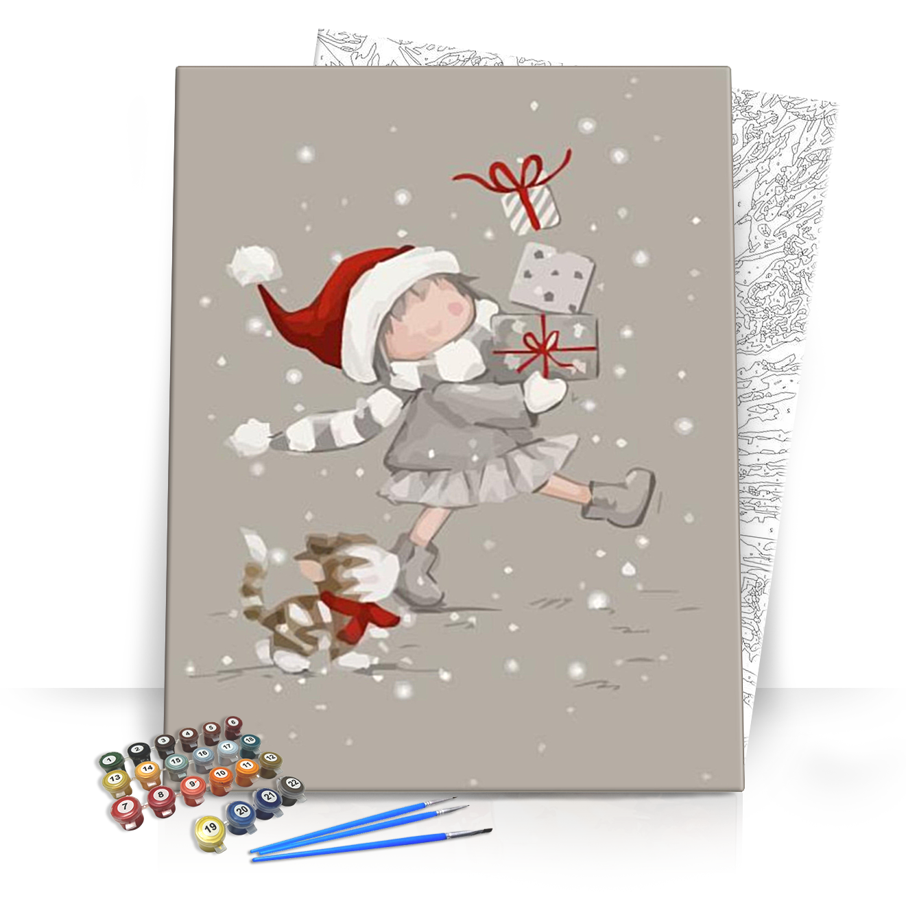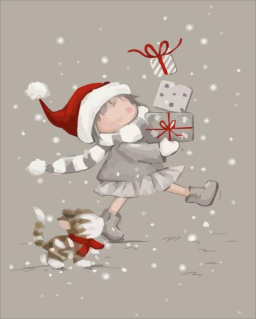 Ünnepi hangulatot varázsolhat otthonába a **Karácsonyi manó** számfestő készlet segítségével! Ez a bájos, hóesésben játszó kisgyermek és a hűséges kis kedvence, a szépen becsomagolt ajándékokkal a kezében mindenki szívét megdobogtatja. A szelíd színek, mint a puha szürke, piros és fehér kombinációja, és az egyszerű, de kedves vonalvezetés ideális választás azoknak, akik szeretnék megtapasztalni a festés örömét, akár előzetes tapasztalat nélkül is.