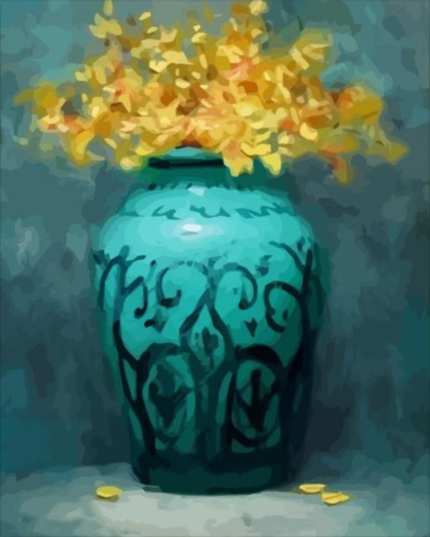 A készletben található egy elegáns kék vázát ábrázoló festmény, amelyet gazdag sárga virágok díszítenek. A háttér lágy kék árnyalata fokozza a vázához való kontrasztot, míg a finoman kidolgozott részletek életre keltik a képet. Ez a varázslatos kép a természet szépségét és eleganciáját tükrözi, ideális választás bármilyen otthon díszítésére.