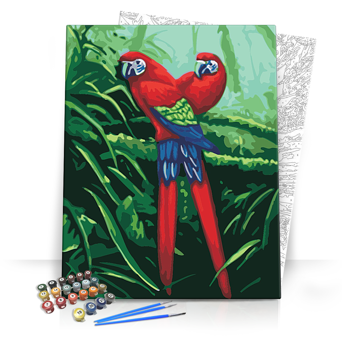 Ne habozzon, fedezze fel a festés örömét e különleges Két Papagáj számfestő készlettel, és hozza létre saját trópusi műalkotását!