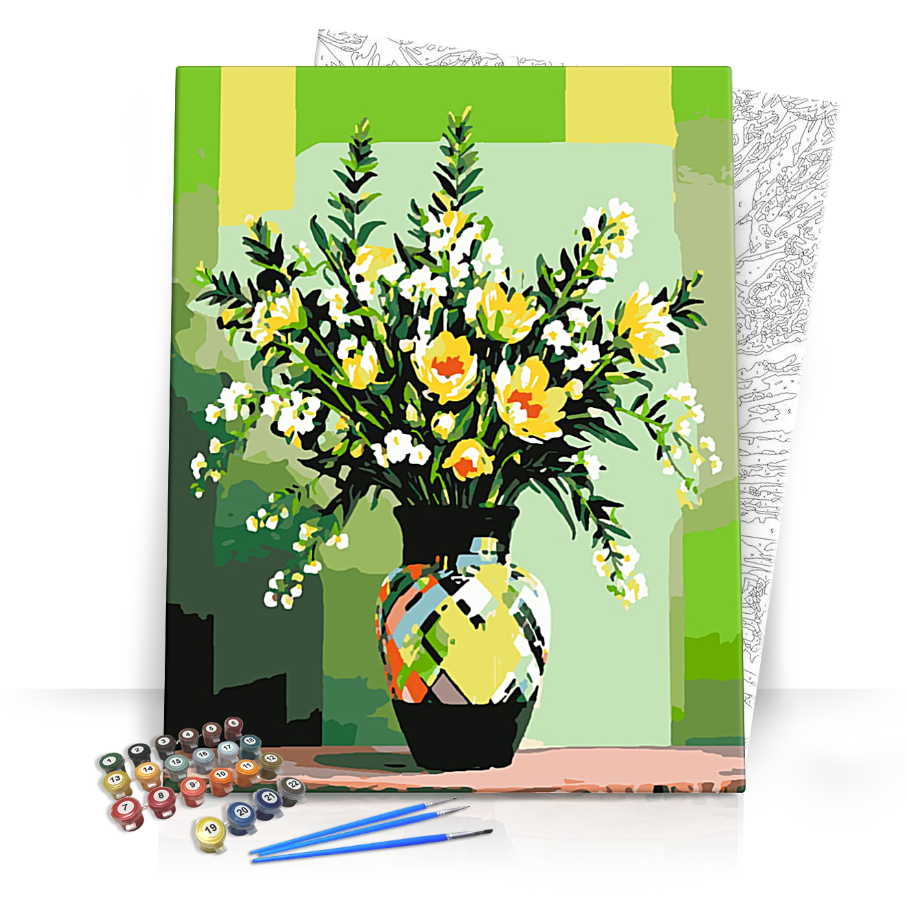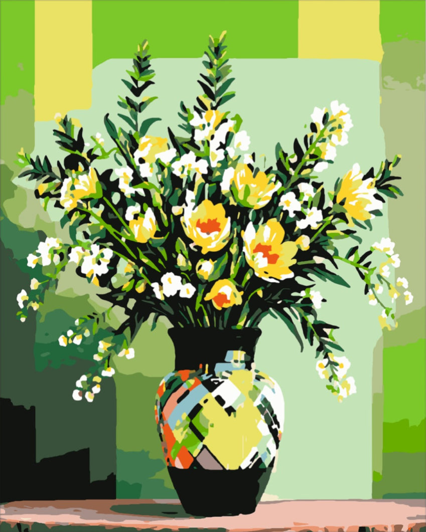 Merülj el a festészet varázsában ezzel a lenyűgöző számfestő készlettel, amely a tavasz frissességét és színeit idézi meg! A gyönyörű virágcsokor, amely az élénk sárga és fehér virágokkal teli vázát díszíti, bármely otthon díszévé válik. A harmonikus zöld háttér és a színes cserép kiemeli a virágok szépségét, így a végeredmény igazán lenyűgöző lesz!