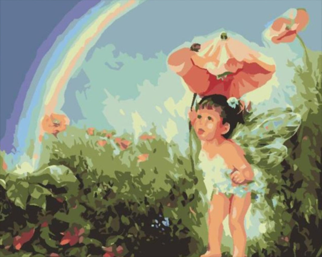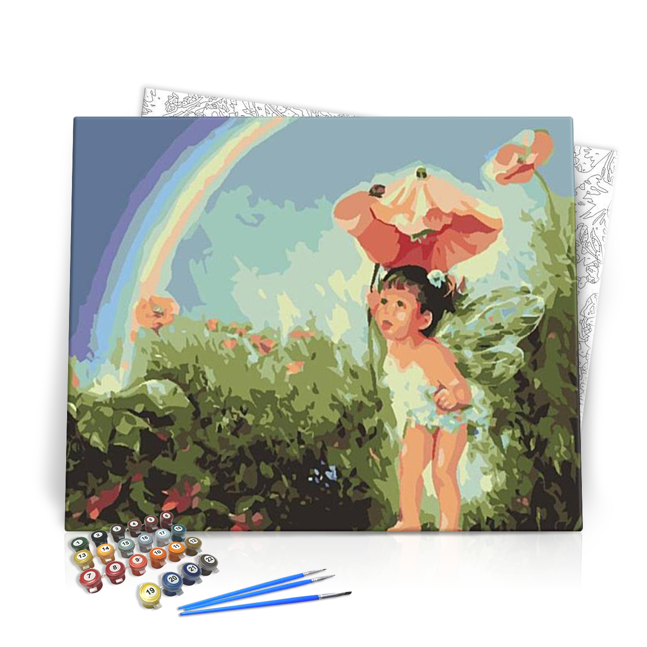 Merülj el a természet varázslatos világában a Kis tündér a réten számfestő készlettel! Ez a szemet gyönyörködtető alkotás egy bájos kis tündér látványát tárja elénk, aki egy óriási virág alatt bujkál, miközben a háttérben szivárvány színei ragyognak. A tündér, apró szárnyaival és mosolygós arcával, játékosságot és ártatlanságot sugároz, míg a virágok és a zöld fű összhangban élik mindennapjaikat. Az élénk színek és a harmonikus kompozíció garantáltan felvidít és kreatív inspirációt nyújt!