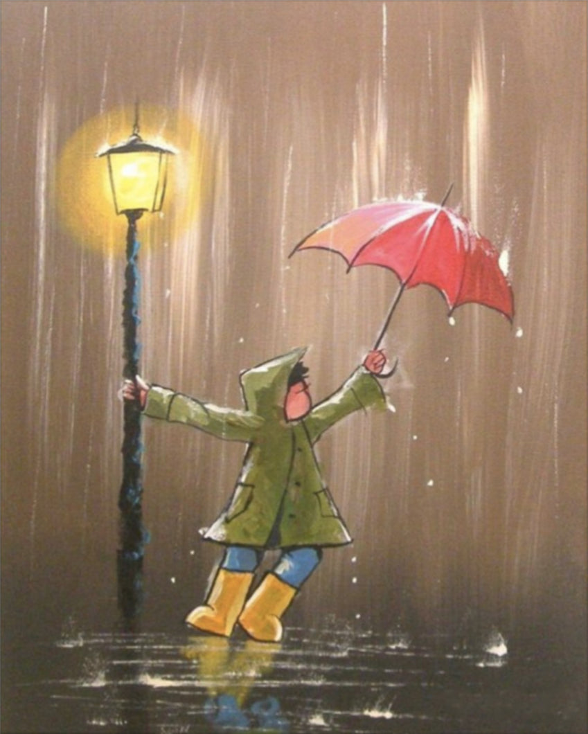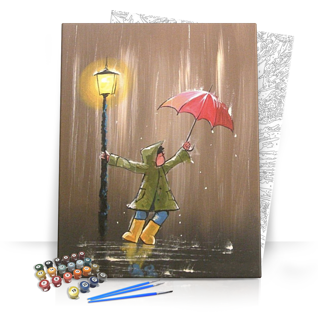 Fedezd fel a kreativitás világát a Kisgyerek az esőben - számfestő készlet segítségével! Ez a bájos kép egy vidám kisfiút ábrázol, aki boldogan ugrál az esőben, piros ernyőjét magasra tartva. A háttérben egy lámpa lágy fénye világít, miközben az esőcseppek az aszfalton táncolnak. A gyönyörű színpaletta, amely a zöld, sárga és piros árnyalatokat ötvözi, életvidámságot és örömöt sugall.
