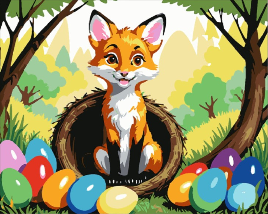 Fedezd fel a tavasz varázsát a Kisróka Húsvéti Tojásokkal számfestő készlettel! Ez a bájos kép egy aranyos kis rókát ábrázol, aki vidáman ül a fából készült búvóhelyén, körülötte színes, festett tojások tömkelege található. A tavaszi rét zöldellő háttere és a háttérben lévő hegyek varázslatos atmoszférát teremtenek, amely tökéletesen illeszkedik a húsvéti ünnepekhez. Az élénk színek és a részletgazdag ábrázolás garantálja, hogy mindenki megtalálja a hozzá illő színt!