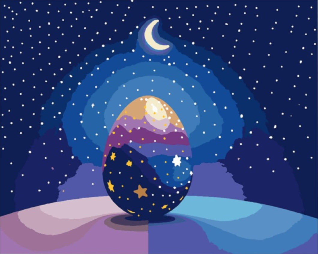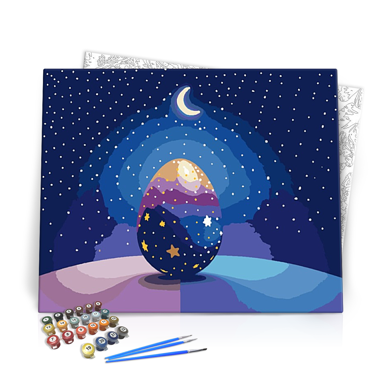 Merülj el a kozmikus szépség világában, ahol a csillagok és a színek varázslatos összhangban találkoznak! A "Kozmikus Tojásvarázs" számfestő készlet nemcsak egy festmény, hanem egy utazás a kreativitás és a képzelet határain túl. Képzeld el, ahogy a sötét kék éjszakában ragyogó csillagok és a titokzatos tojásformák szemet gyönyörködtető harmóniáját varázsolod a vászonra! Ez a készlet minden korosztály számára ideális, hiszen élvezhető előzetes festői tudás nélkül is!